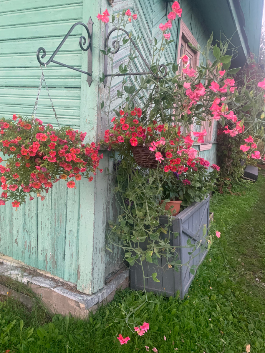 Купили два подвеса, год пролежали, в этом сезоне повесили. Вообще задумка была для лобелии и фуксии, но в жару им там было не комфортно , а вот калибрахао понравилось. Ну и горошек не плохо с ними сочетается .