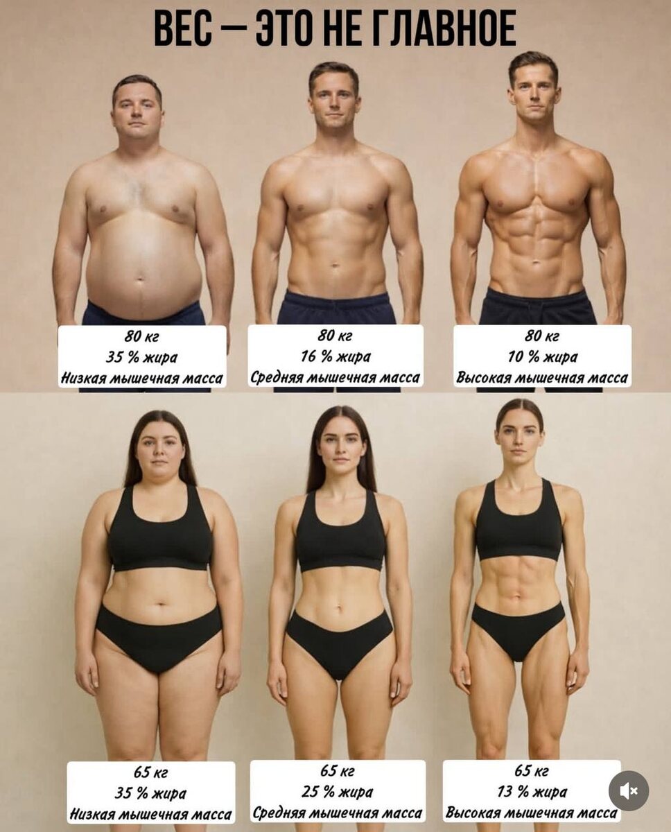 📍Приоритет «Золотой середины» (20–22%) для девушек. Это состояние, при котором тело выглядит спортивным, но при этом: ✨Цикл регулярный, а ПМС минимален. ✨Уровень энергии стабилен, нет «тумана» в голове. ✨Метаболизм активен, и вам не нужно голодать, чтобы поддерживать форму. ⠀ А теперь (Мужской взгляд) ⬇️ ⠀ Цифра на весах — лишь одна из метрик. Реальная картина определяется составом тела: соотношением мышц, жира и воды. Вот наглядный пример. ⠀ ✨Если приоритет Сухая масса (10–13% жира) Тело с выраженной мышечной рельефностью, но минимумом жира. ⠀ • Как отреагирует организм: Риск снижения уровня тестостерона, постоянный контроль питания, возможна утомляемость. Что будет с энергией и фокусом: Часто зависит от «загрузок» и стимуляторов. Поддержание формы требует дисциплины, близкой к экстремальной. ⠀ 🔴Итог: Эстетика ценою ресурсов. Подходит для соревновательных целей, но редко является здоровой повседневной нормой. ⠀ ✨Если приоритет Функциональный баланс (15–18% жира) Оптимально для здо