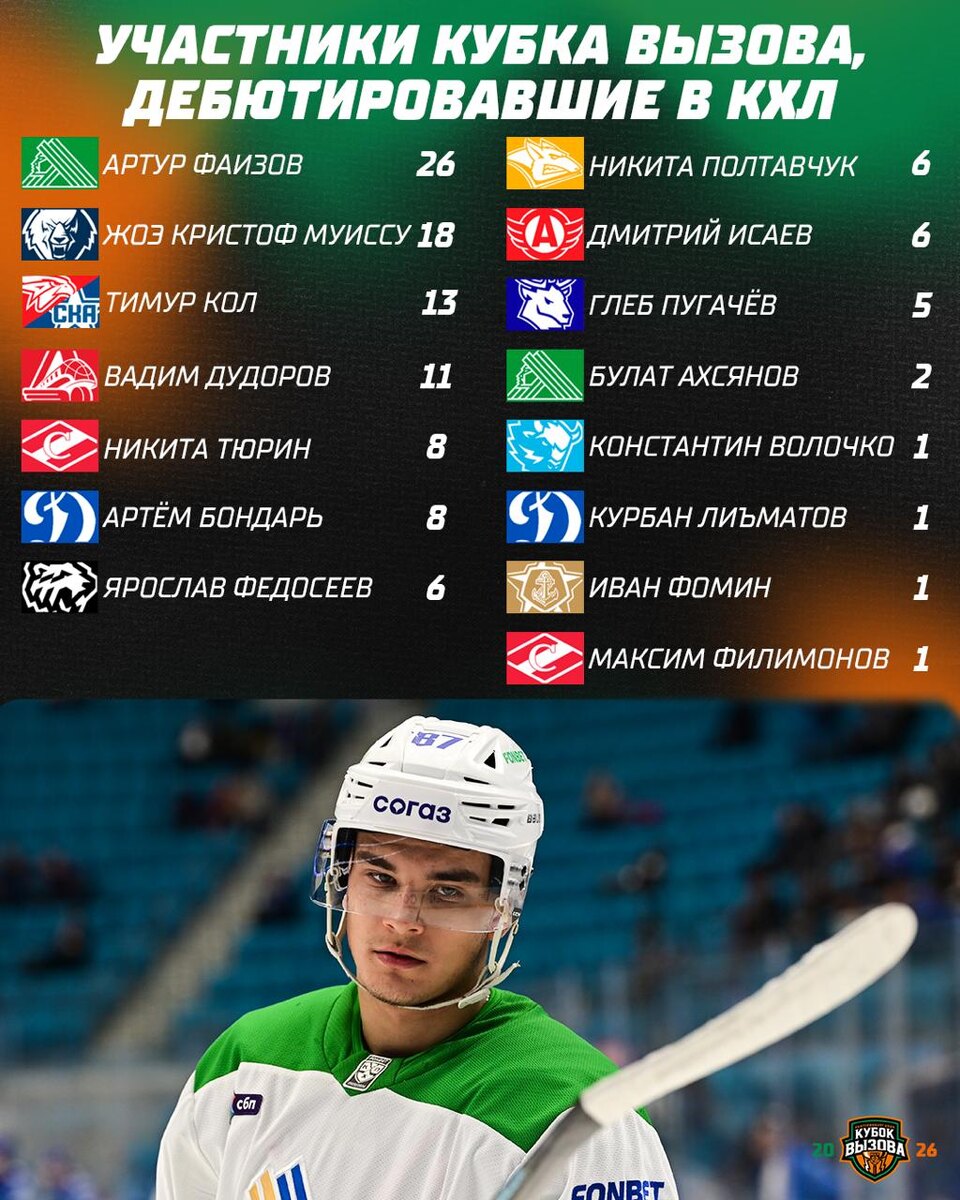 У кого больше всего игр? 6️⃣ февраля 2️⃣0️⃣2️⃣6️⃣ года в Екатеринбурге пройдёт Кубок Вызова, на котором сыграют 4️⃣4️⃣ игрока Молодёжной хоккейной Лиги. 2️⃣5️⃣ из них уже имеют опыт игры на взрослом уровне в КХЛ и/или ВХЛ. 🎫 allstarweek.com | «Яндекс Афиша» #КВ2026 🏒@mhlrus