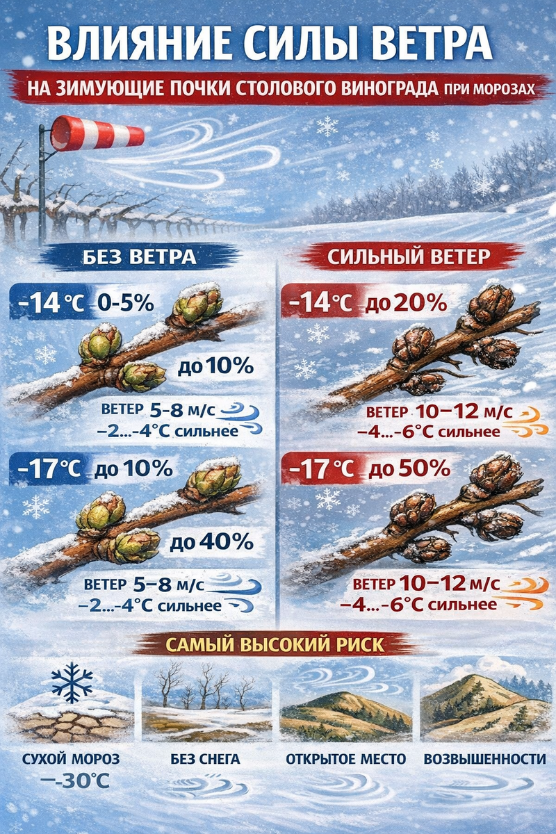 Зимой для столового винограда опасна не только низкая температура, но и ветер.