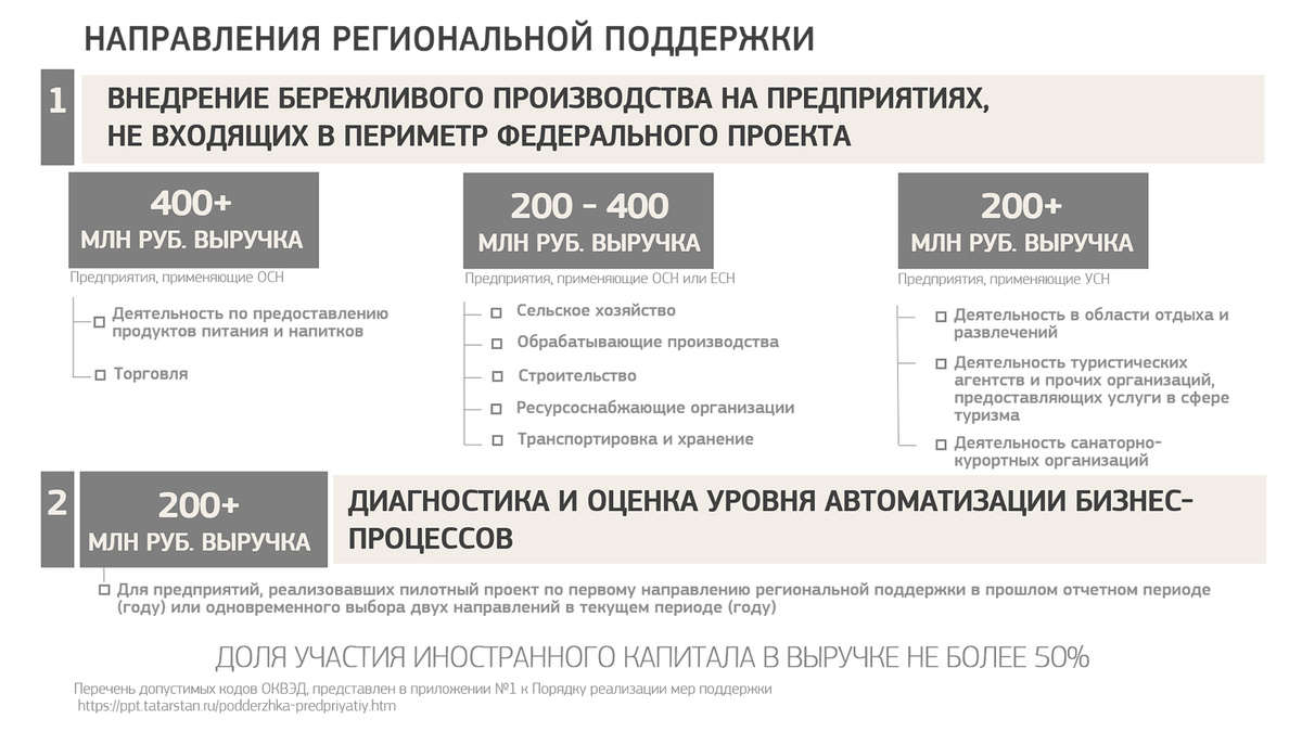 🏭 В Республике Татарстан возобновлён приём заявок на участие в региональном проекте «Повышение производительности труда» (далее — региональный проект) государственной программы Республики Татарстан «Экономическое развитие и инновационная экономика Республики Татарстан» (ПКМ от 31.10.2013г. № 823). Региональный проект предусматривает экспертную поддержку предприятий с выручкой от 200 млн рублей: ⭕️ по внедрению инструментов бережливого производства и обучению сотрудников их использованию; ⭕️ по реализации комплексных проектов: диагностика предприятия и выработка решений по оптимизации бизнес-процессов с использованием бережливого производства и ИТ-продуктов. 🏢 Государственную поддержку предприятиям оказывает региональный центр компетенций в сфере производительности труда (ГАУ «Центр энергоресурсоэффективных технологий Республики Татарстан», далее — РЦК РТ) на безвозмездной основе. Квоты ограничены. 🔎 Ознакомиться с деталями участия можно на официальном сайте Контакты от РЦК РТ: 🚮
