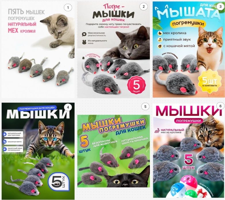 Вчера писала о том, что все падают, а товары для животных растут. Решила их посмотреть, и действительно - там рай. Взяла игрушки для кошек, раз их просто больше, чем собак. Серые мышки из натурального меха - 5 штук. Цены 200-250 рублей. Давно я не видела, чтобы карточки продавали с обложки. У большинства карточек внутренняя воронка фактически отсутствует - пара слайдов и всё. Есть те, у кого побольше, но разницы в конверсиях это не дает. Конверсии внутри у всех хорошие. Вот, что значит растущий рынок. Невероятно, но людям здесь достаточно обложки. У двух обложек конверсия из поиска сразу в корзину больше 1%. Это очень и очень много, в других категориях такой CTR бывает, а тут сразу в корзину. Поэтому сегодня смотрим только обложки. При таких условиях достаточно дать рекламу, показываться выше - и сразу выше CTR. Поэтому сегодня для чистоты оценки влияния обложки будем искать самую продающую обложку, которую сразу добавляют в корзину. У какой обложки самая большая конверсия из поиска в