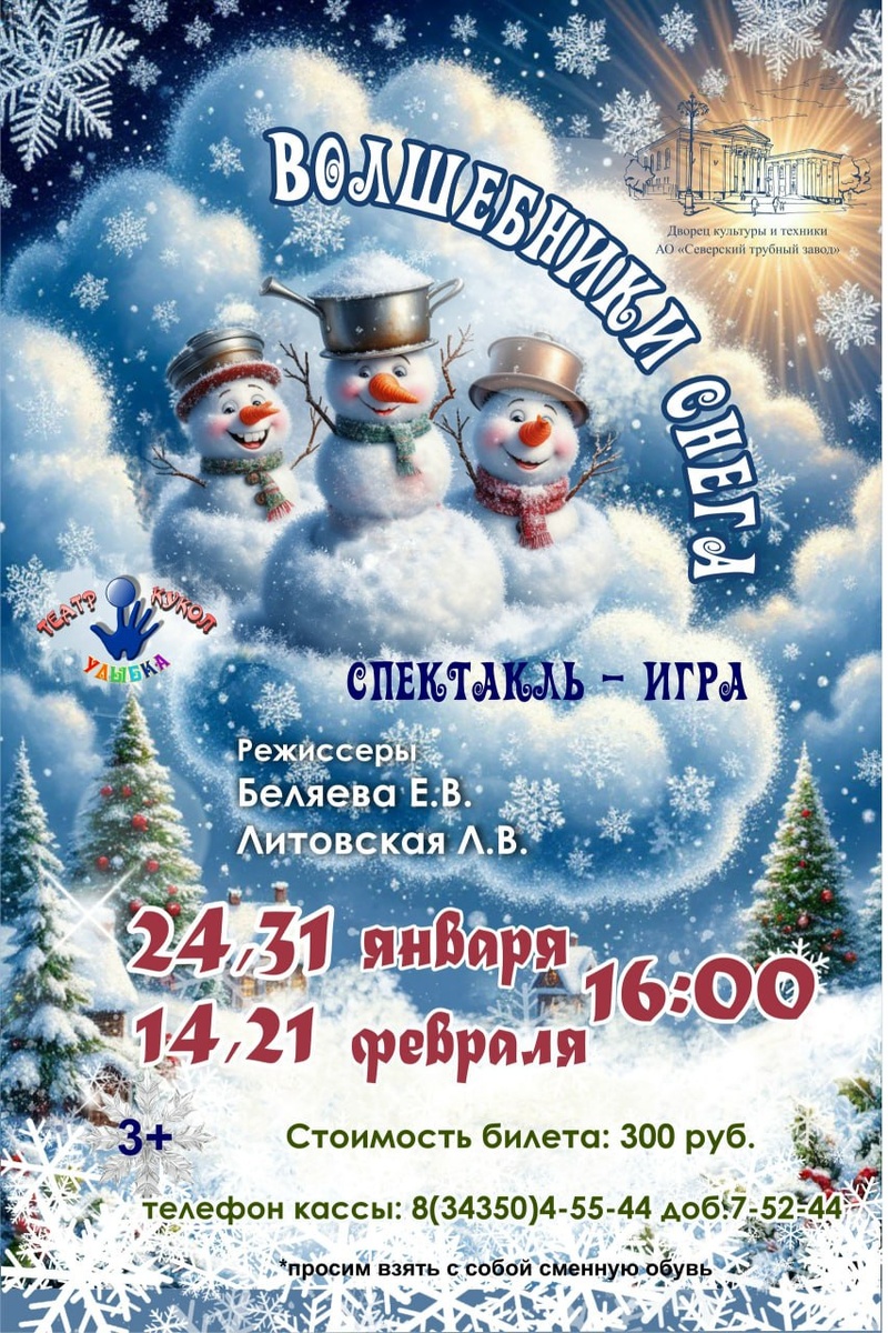! Спектакль-игра "Волшебники снега" ⛄️ Приглашаем вас насладиться доброй историей о взаимопомощи и настоящих новогодних чудесах, созданных самой природой и искренними сердцами героев спектакля. режиссеры: Евгения Беляева, Лариса Литовская ✅ Когда: 24, 31 января , 14,21 февраля в 16:00 ✅ Продолжительность: около 25-30 минут Насладитесь теплом нашего маленького театра, полным улыбок и радостных эмоций! Чтобы сделать посещение комфортным, пожалуйста, заранее позаботьтесь о смене обуви. ❄️ До встречи в сказочном мире зимы и магии вместе с театром "Улыбка"!