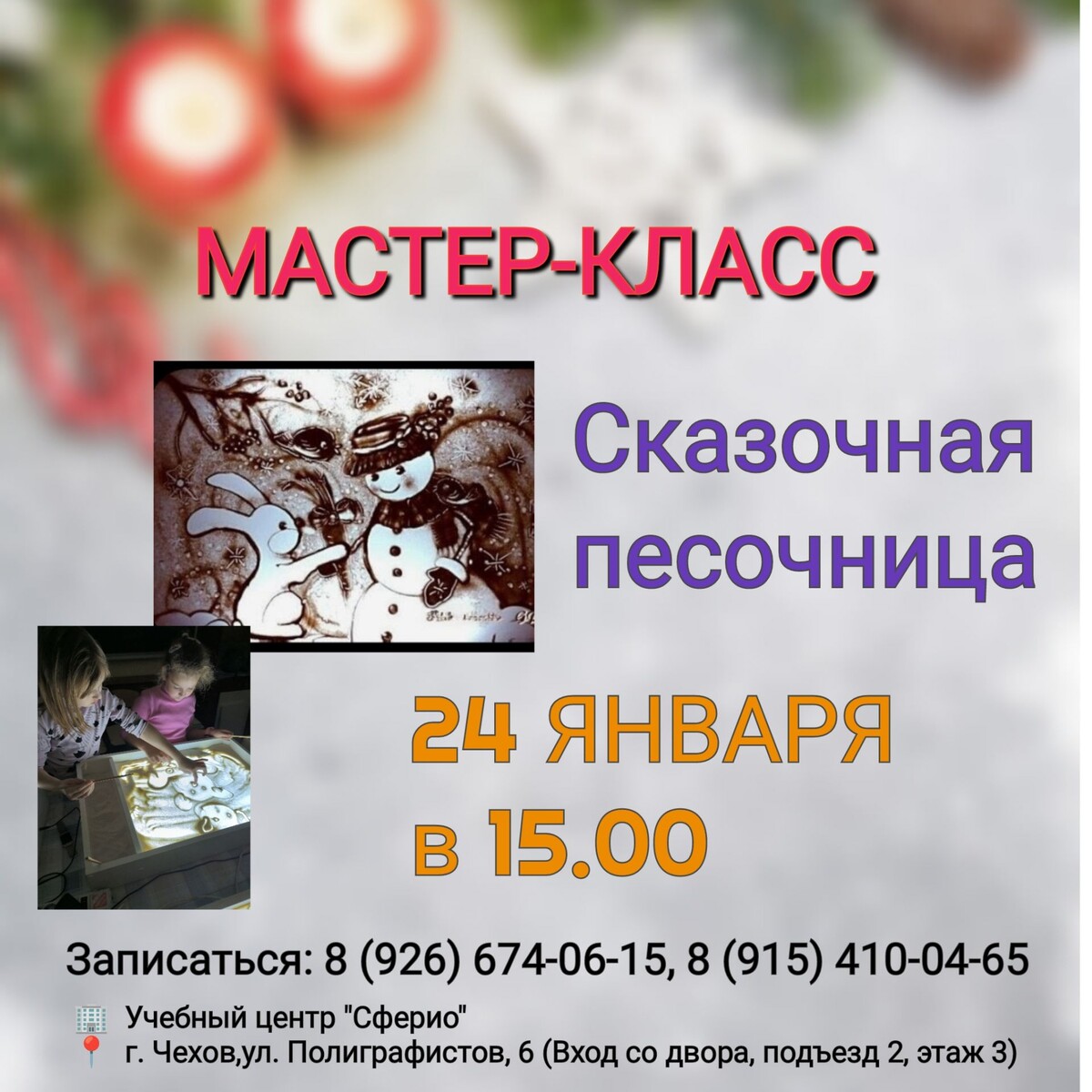 ✨ 🎨✨ Волшебный мир рисования песком! ✨🎨 Приглашаем вас в удивительное путешествие в мир творчества и фантазии! 🌀 На нашем мастер-классе вы: - Научитесь создавать настоящие шедевры на песке 🏖️ - Откроете для себя новый вид искусства 🎨 - Сможете нарисовать всё, что подскажет ваша фантазия 💫 - Получите море положительных эмоций 🎉 📆 24.01.2026 🕛 15:00 🏢 Учебный центр "Сферио" 📍 г. Чехов,ул. Полиграфистов, 6 (Вход со двора, подъезд 2, этаж 3) 🔗 Записаться: https://t.me/UZentrSferio2024 Наши соцсети 📲⬇️ ➡️ ВК https://vk.com/sferio_kids ➡️ ТГ https://dzen.ru/id/672e115c65592e5989376c34 ➡️ Продленка https://vk.com/prodlenkachehov ➡️ Школа https://vk.com/sferio_school 🎁Забрать подарок:🎁 https://t.me/bot_sferio_bot 💥 Подпишись и получи подарок 💥 Наша What'sApp группа