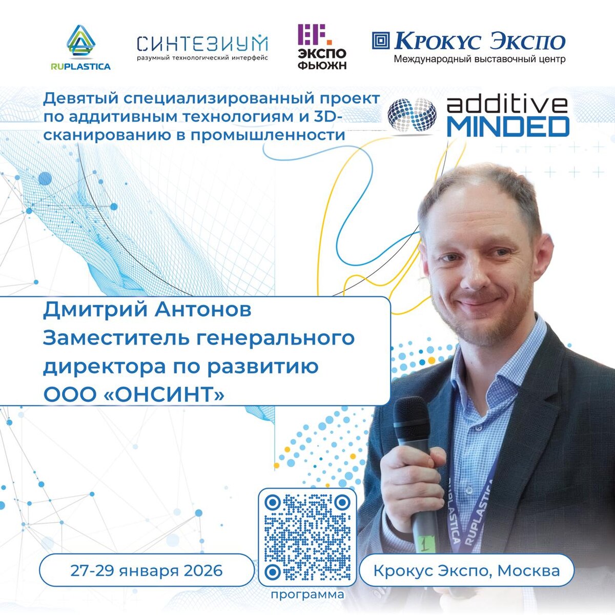 Представляем участников деловой программы Дмитрий Антонов, заместитель генерального директора по развитию ОНСИНТ, выступит с темой «Новинки технологических решений в сфере 3D-печати порошковыми материалами». Магистр в области лазерной техники и технологий, Дмитрий — специалист, за плечами которого — участие в создании и открытии инжинирингового центра лазерных технологий, внедрение роботизированных комплексов в промышленность, десятки реализованных проектов — от микрообработки до гибридных систем лазерной наплавки. Дмитрий расскажет о новинках компании, которые задают новую планку в области аддитивного производства: от медных компонентов до сложных полимерных конструкций, от программных решений до готовых изделий. Будет полезно тем, кто хочет видеть в 3D-печати не лабораторный эксперимент, а промышленный инструмент. 🧬 Additive Minded 2026 📹 27–29 января, Крокус Экспо, Москва 📲 Регистрация | Деловая программа