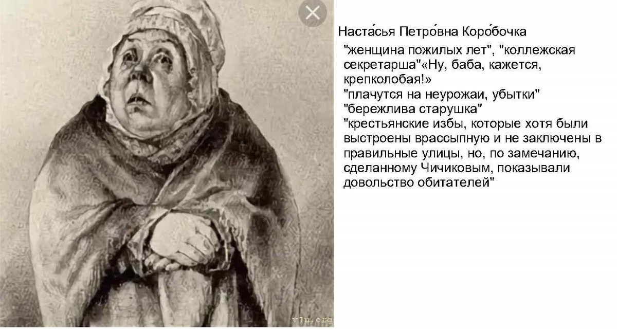 Решила добавлять важные характеристики персонажа на "портрет". Настоящая опора для краткого анализа или сочинения. Итак, бережливая старушка Коробочка Настасья Петровна, способная довести в диалоге спокойного Чичикова до исступленного гнева, между прочим - коллежская секретарша. А о чем это? Конечно, это не говорит о том, что царская Россия была благосклонна к женщинам. Лишь свидетельство о том, что она - вдова мелкого чиновника. Но Коробочка представляется именно так новому знакомому, попавшему к ней случайно из-за пьяного кучера. Видимо, бережет чины так же, как и все остальное в своем хозяйстве. Между прочим, именно Коробочка представляет собой помещика бережливого, который вникает во все дела и ведет учет и работы. ..."находившийся перед ним узенький дворик весь был наполнен птицами и всякой домашней тварью"..."пространные огороды с капустой, луком, картофелем, свеклой и прочим хозяйственным овощем. По огороду были разбросаны кое-где яблони и другие фруктовые деревья"..."довольств
