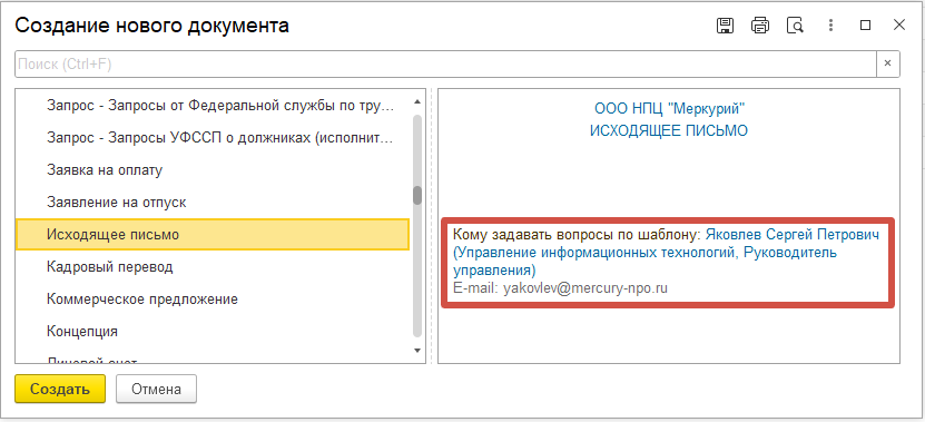 Вы указаны в реквизите "Кому задавать вопросы по шаблону" в форме создания нового документа. Проблема найдена, путь решения прост. Если у нас несколько шаблонов к данному виду документа, то всё легко, открываем вид документа, кликаем на страницу Создание документов, переходим в раздел шаблоны, открываем нужный нам. В открывшемся окне видим реквизит Автор и меняем его значение на бесячего коллегу, системного пользователя или сотрудника. Нажимаем Записать и закрыть. Если у нас один шаблон, то и реквизита Автор на форме нет, можно конечно воспользоваться гиперссылкой Добавить новый шаблон, создать тестовый, потом открыть нужный нам и отредактировать, затем удалить тестовый, но это даже звучит не очень :( Поэтому мы через Функции для технического специалиста открываем справочник Шаблоны документов. Далее ищ
