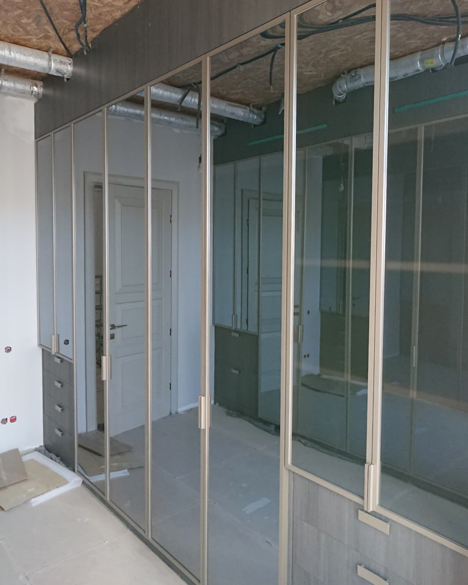 Эту мебельную композицию мы спроектировали и изготовили для интерьера квартиры на Кутузовском проспекте. Проект построен как цельная система хранения, где функциональность сочетается с аккуратной архитектурной подачей и выверенными пропорциями. Фасады - модели Loft выполнены из алюминиевого профиля в цвете "Шампань" с закалённым стеклом Stopsol бронзового оттенка. С лицевой части фасадов стекло с зеркальным напылением, а на внутренней поверхности - выполнена пескоструйная обработка. Также мы установили скрытые петли. Внутреннее наполнение мы сделали из ЛДСП Egger FineLine средне-серого оттенка толщиной 16 и 25 мм. Материал подчёркивает графичность конструкции и создаёт спокойный, нейтральный фон для хранения. В верхней части шкафов интегрирована вентиляция, аккуратно встроенная в общую конструкцию. Также мы сделали шкаф с раздвижными дверями в той же отделке, но это уже модель Slim-Art Prizma. Раздвижная система позволяет рационально использовать пространство, а тонкий профиль и еди