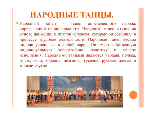 - Образование: Через изучение и исполнение народных танцев люди познают культуру, историю и традиции своего народа.