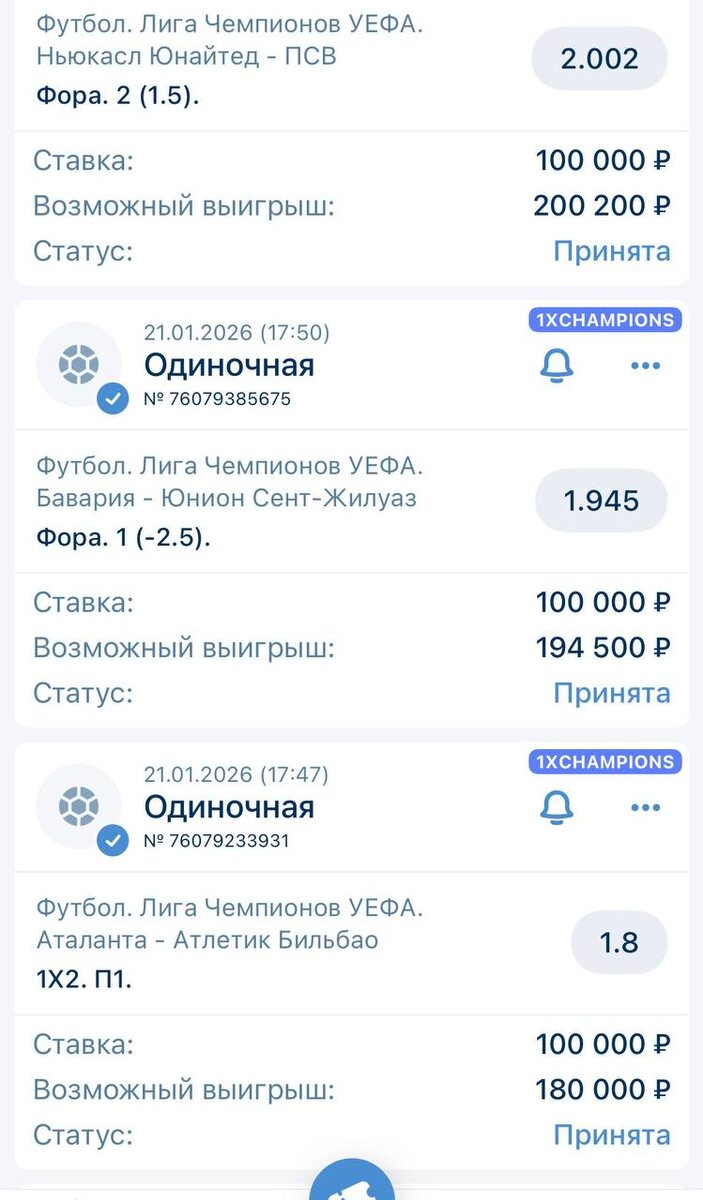 18 +. Не является ИИР. Рубрика #ЛудкасБородой Лига Чемпионов. Вчера чутка проебался и добавил пару сегодняшних матчей (первые два). Продублирую на всякий случай. Галатасарай - Атлетико Мадрид. Атлетико разберется тут без особых проблем. П2 за 2,1 кф. Карабах - Айнтрахт. Айнтрахт идёт фаворитом, но хз, играют как ебаные бомжи весь сезон. Карабах крепкий, думаю дома не проебут. Двойной шанс Карабах за 1,74 кф. Аталанта - Атлетик Бильбао. Аталанта будет играть первым номером тут, а Атлетик искать счастья на контратаках. Учитывая тот факт, что последние 3 матча в ЛЧ Атлетик отыграл с нулем по голам и их текущую форму, то Аталанта должна побеждать тут. П1 за 1,8 кф. Бавария - Юнион. Бавария тут явный фаворит. Вряд ли немцы на своем поле за тур до окончания общего этапа не воспользуются шансом гарантировать себе выход в 1/8. Бавария отдохнувшая, январские матчи с отличной результативностью это подтверждают. Настрой игриво-позитивный. Правые же просто бомжи. Фора Бавария -2,5 за 1,94 к