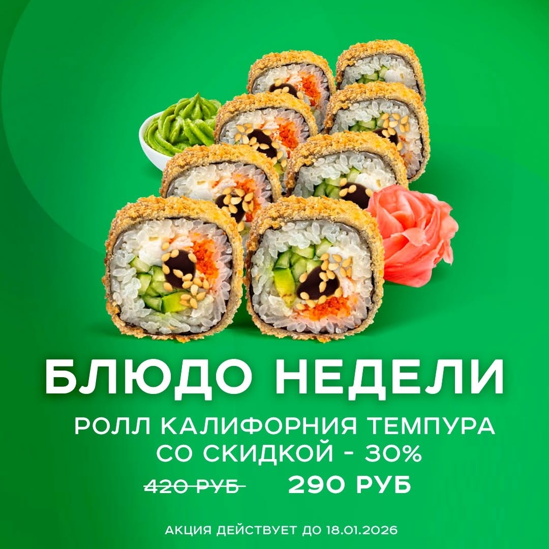 🥘 На улице снегопад, а мы запускаем для вас ценлопад🌨️ Скидка 30% на жареную "Калифорнию темпура". Успейте попробовать, ведь акция ограничена до 18.01.2026. Пусть вас согреет наш вкусный ролл в это морозную погоду🥰 ~ⓒⓐⓛⓛ ⓜⓔ~ Принимаем заказы ежедневно: ⏳С 11:00 до 23:00 📱+7(926)799-93-93 Также можете сделать заказ на сайте: 💿 ionoto.ru/ 📶 Категория: Ресторан 🏢 Место: Доставка еды "Ионото суши" 📍Адрес: г. Подольск, Северная ул., 9А ⏱ Часы работы: 11:00 – 22:30 ✅ Где поесть, Подольск!? https://dzen.ru/id/6756016c107ef731969e16a5 https://vk.com/gde_poest_podolsk https://dzen.ru/gde_poest_v_podolske