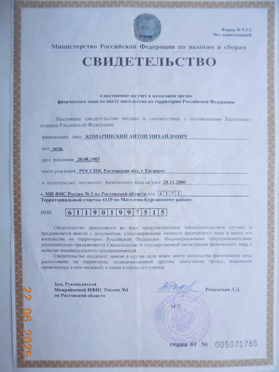 В Межрайонную ИФНС России № 1 по Ростовской области было написано заявление физического лица о выдачи документа, подтверждающего присвоение идентификационного номера налогоплательщика (ИНН) от 27.09.2005 г. (приложение № 7 утв. Приказом МНС России от 03.03.2004 № БГ-3-09/178 Форма № 09-2-1). Далее форма № 09-2-1 Экз. единственный Министерство Российской Федерации по налогам и сборам выпустило СВИДЕТЕЛЬСТВО о постановке на учет в налоговом органе физического лица по месту жительства на территории Российской Федерации, серия 61 № 005071785. Что подтверждает постановку физического лица на учет 28.11.2000 в МИ ФНС России № 1 по Ростовской области код 6171 Территориальный участок 6119 по Матвеево-Курганскому району ИНН 611901997515 (двенадцать цифр кода). Настоящее свидетельство подписано Зам. Руководителя Межрайонной ИФНС России № 1 по Ростовской области Роменская Л.Л., которое выдано на руки человеку. Фотографию от 22.06.2025 г. свидетельства прилагаю следующее. Приложение: 21 день месяц