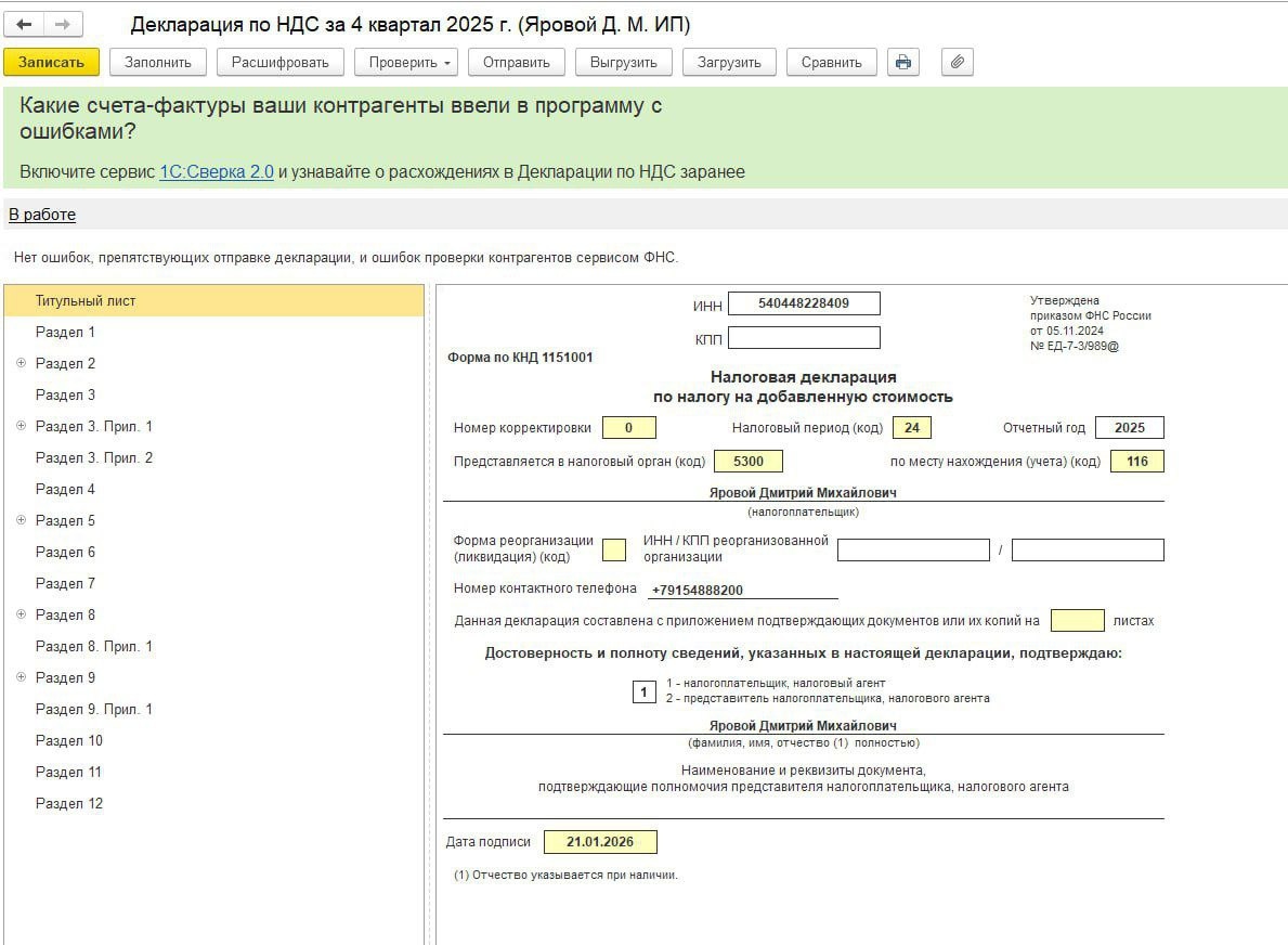 😏 Держите чек-лист для проверки перед сдачей Декларации по НДС за 4 квартал В этом году 25 число выпадает на воскресенье, поэтому есть один лишний день, но расслабляться не стоит. Чтобы декларация ушла без ошибок и не «загорелась» красным в налоговой, прогоните свою базу 1С по этому чек-листу👌🏻 1️⃣ Первичка и выписки. Проверьте, все ли подгружено. Не только банк, но и кассу. Если в базе висят хвосты по не проведенным документам поступления или реализации — НДС не сойдется. 2️⃣Чистим развернутое сальдо по 60 и 62 счетам. Формируем ОСВ по ним с максимальной детализацией (Контрагенты + Договоры + Документы расчетов). Если видите одновременно Дт и Кт по одному договору — зачет аванса не сработал. НДС с авансов улетит в ошибку. 3️⃣ Хронология — святое. В НДС последовательность документов решает все. Перепроводим квартал. Сделать это можно через «Закрытие месяца» или в помощнике «Отчетность по НДС». Это восстановит правильные зачеты авансов и восстановит НДС, где это нужно. 4️⃣Аванс