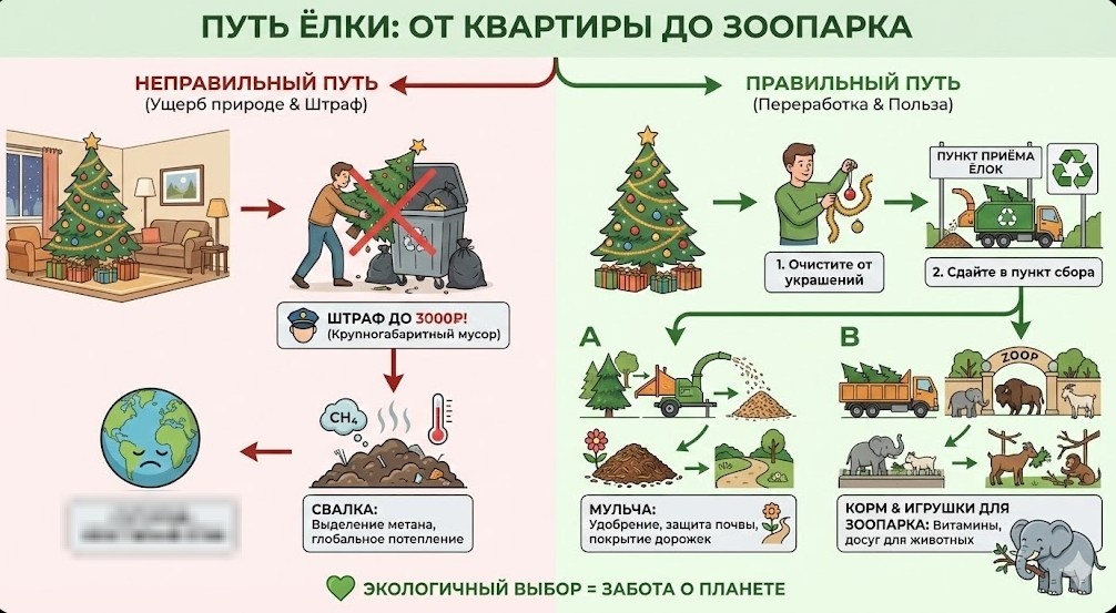 🎄 Елка с «сюрпризом»: Почему выброшенное дерево может стоить вам 3 000 рублей Праздники подошли к концу, и пришло время прощаться с главной виновницей торжества. Но не спешите нести её к обычному мусорному баку. Юристы предупреждают: за неправильную утилизацию новогоднего дерева предусмотрены штрафы. В чем юридическая загвоздка? Согласно правилам обращения с отходами, елки относятся к крупногабаритным отходам (КГО). Запрещено: Заталкивать елку в обычный серый или синий контейнер. Это может повредить прессующий механизм мусоровоза. Штраф для физлиц — до 3 000 рублей. Разрешено: Оставлять дерево на специальной площадке для крупногабаритного мусора (обычно это огороженный загон рядом с баками) или везти в пункты переработки. 🧬 5 фактов об утилизации елок, которые вас удивят Газовая атака на свалке: Когда елка попадает на обычный полигон и оказывается под слоем другого мусора, она разлагается без доступа кислорода. В результате выделяется метан, который в 25 раз сильнее влияет на глобаль