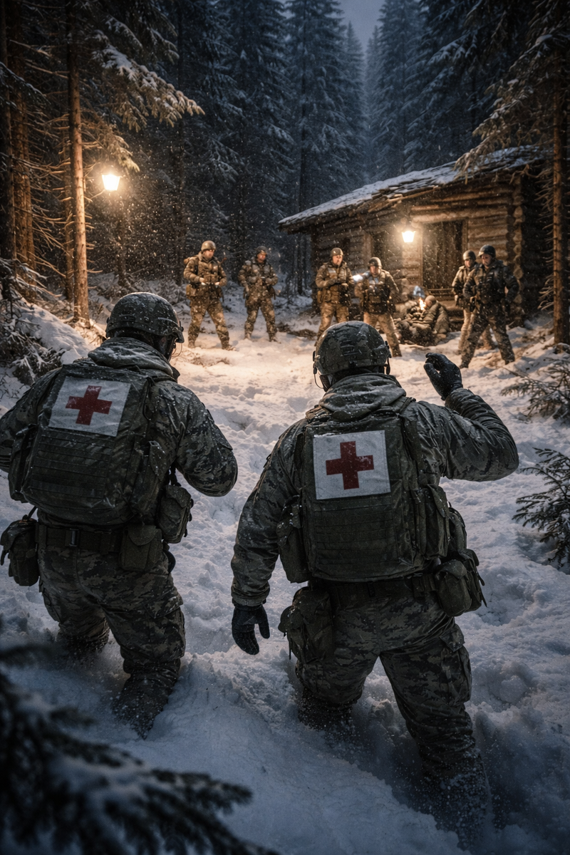 – По данным перехвата, к ним кто-то движется. Через десять-пятнадцать минут будут здесь, – майор говорил быстро, деловито. – Как только услышите гул – вы с Глухарёвым выходите на поляну вот с этой стороны. Идёте медленно, не бегом. Руки вверх или держите сумки так, чтобы кресты были видны. Кричите что-то вроде: «Медики! Эвакуация!». Ваша задача – быть максимально заметными и недвусмысленными. Всё остальное – наша работа. Запомните главное: как только услышите первый выстрел – не раздумывая, на землю. Ложитесь и не двигайтесь, не оглядывайтесь. Поняли?