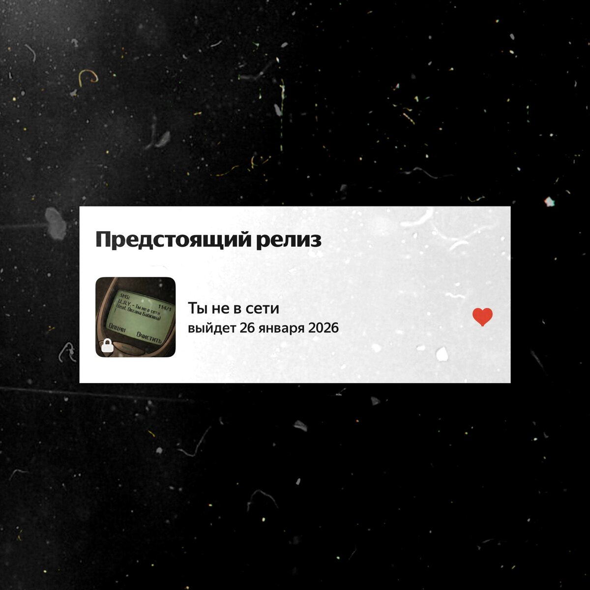 "Ты не в сети" в Яндекс Музыке Для добавления в избранное достаточно: 1) Зайти в карточку музыканта (https://music.yandex.ru/artist/10026908) 2) Сразу увидишь «Предстоящий релиз» 3) Нажимаешь на сердечко♥️ 26 января в 00:00 по Москве трек будет доступен для прослушивания🎧 Также можно сделать пресейв на других площадках: https://band.link/youre_offline VK | Яндекс Музыка | MAX Поддержать | Футболки