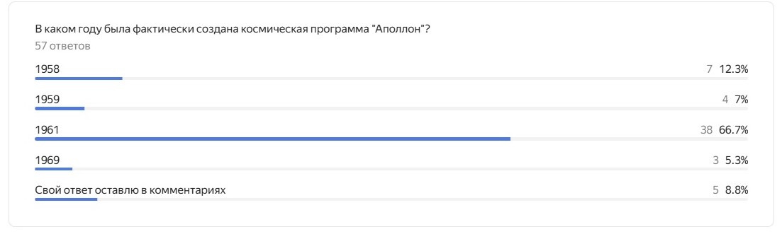 Казалось бы простой вопрос, и многие ответили что программа "Аполлон" была утверждена в 1961 году, после речи президента США Джона Кеннеди. И это конечно же верно, если мы говорим о программе "Аполлон" как о чисто лунной программе, но, как говорится - "тут не все так однозначно". Вопрос был с подвохом.