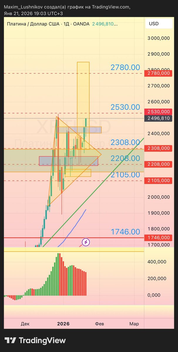 ) Платина после завершения коррекции формирования паттерна при пробитие сопротивления 2530 ожидаем рост. Встану с руки с целью 2780. Может также вынести на коррекции, так как приближаемся к локальному максимуму 2530, будьте аккуратны. ⚠️ Не является инвестиционной или торговой рекомендацией. Материал носит информационный характер.