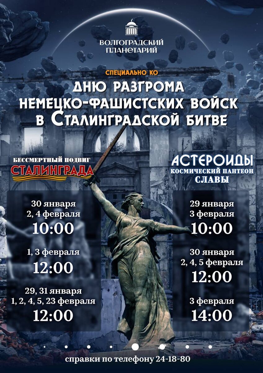 ..................................... ЦИКЛ ПРОГРАММ В РАМКАХ 2 ФЕВРАЛЯ Дня разгрома советскими войсками немецко-фашистских войск в Сталинградской битве #Патриотические_программы_В_планетарии ..................................... ⠀ ⠀ 🧧 Полнокупольная программа «БЕССМЕРТНЫЙ ПОДВИГ СТАЛИНГРАДА» — ощутить масштабность и драматизм великой войны, благодаря новейшим технологиям, в сочетании с кинохроникой военных лет. Тематическая структура программы отражает основные этапы Сталинградской битвы. ⠀ В 2024 году программа стала Лауреатом I степени государственной премии Волгоградской области ⠀ ➡️ Показы пройдут: ⬛️В 10:00: 30 января 2 февраля 4 февраля ⬛️ В 12:00 1 и 3 февраля ⬛️ В 14:00 29 и 31 января 1 и 2 февраля 4 и 5 февраля ⬛️ В 18:00 18 февраля ⠀ 🎗🎗🎗 КУПИТЬ БИЛЕТ ⠀ ⠀ ⭐️⭐️⭐️ ⠀ ⠀ 🧧 Лекционная программа «АСТЕРОИДЫ. КОСМИЧЕСКИЙ ПАНТЕОН СЛАВЫ» повествует об астероидах, которые служат хранителями памяти о великих людях и выдающихся исторических событиях. Они образовали Космический Панте