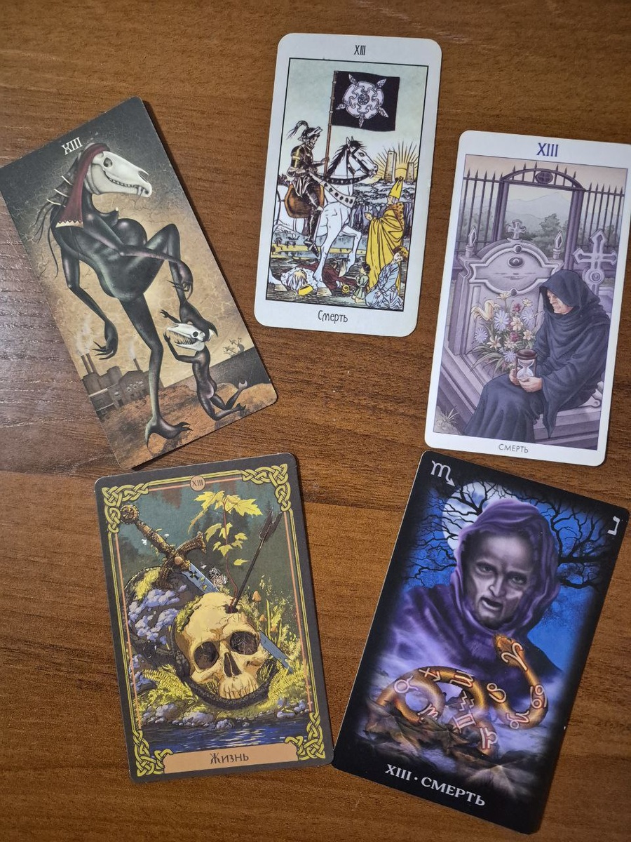 Частый вопрос: а зачем существует несметное количество колод Таро, если есть четко закрепленная система толкований каждой карты? Вот, например, аркан Смерть. Пять колод – пять разных картинок. Это же не значит, что пять значений аркана? Конечно, не значит. Значение всегда одно: глубокие перемены, завершение старого этапа и начало нового. Советует освободиться от прошлого и принять неизбежные изменения. Но какими же разными бывают эти «прошлое», «этапы», «изменения» и другие слова на эту тему. И разные колоды помогают по-разному взглянуть на положение вещей. Вот, например, классический Уэйт. Видим рыцаря, безжалостно уничтожающего прежнего короля и приветствующего нового правителя. «Король умер – Да здравствует король!». На флаге символ цикличности круга жизни. Природа, умирающая за ним и расцветающая перед ним. Карта говорит о неизбежности вечных переходов из одного состояния в другое. Призывает принять и отпустить. Освобождает от старых привычек и выводит из зоны комфорта. В раскладах