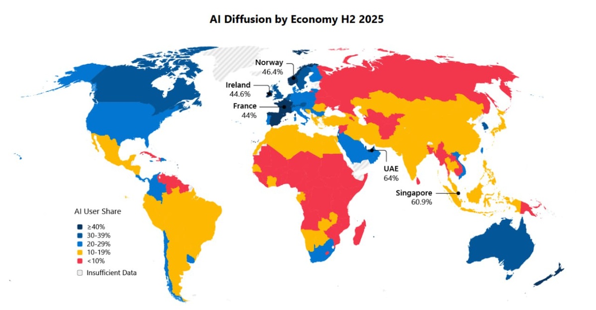 Microsoft опубликовала рейтинг стран по уровню внедрения ИИ-сервисов