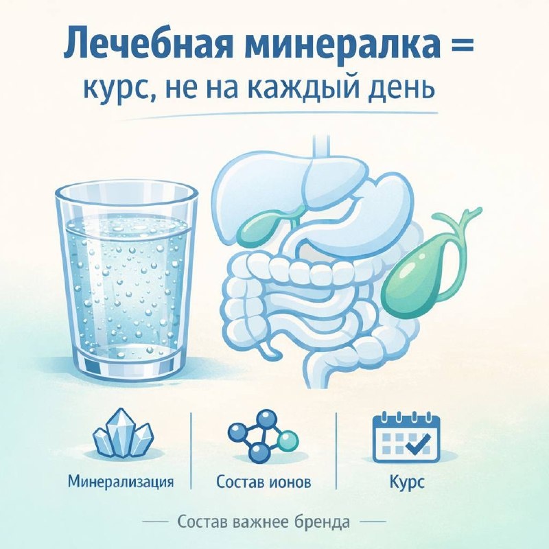 " Минеральная вода работает не названием, а тремя параметрами: 1) Минерализация (сколько солей) 2) Ионный состав (гидрокарбонаты, сульфаты, хлориды; натрий, кальций, магний) 3) Газ и температура при приёме --- ▎📊 Классы по назначению • Столовая — обычно подходит для ежедневного употребления • Лечебно-столовая — уместна курсами и в ограниченных объёмах • Лечебная — только курсом и по показаниям --- ▎⚠️ Почему лечебные воды нельзя пить постоянно Высокая минерализация и избыток отдельных ионов (например, натрия) могут: • Повышать нагрузку на организм • Влиять на кислотность желудка • Изменять моторику кишечника и желчевыделение Поэтому у лечебной воды должна быть "дозировка", курс и противопоказания. --- ▎🏔️ Самые распространённые воды на рынке РФ ▎1️⃣ Ессентуки №4 Состав: гидрокарбонатно-хлоридно-натриевая, средняя минерализация Показания: функциональная диспепсия, гастриты вне обострения, функциональные нарушения желчевыделения (по назначению врача) Курс: чаще 2–4 неде