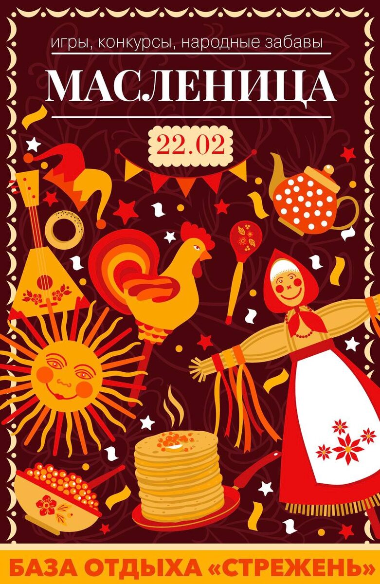 » Приглашаем провести яркие и веселые зимние выходные на свежем воздухе у нас на базе отдыха «Стрежень»! ❄️☀️ 22 февраля – Масленица 🕚 11:00 – открытие праздника! Музыкальная площадка, ароматный шашлык, блины и горячие напитки. 🎨 Мастер-классы – плетение поделок из лыка. 👶 Для детей – аквагрим и сахарная вата. 🎶 12:00 – масленичные гуляния: игры, конкурсы, народные забавы и концерт ансамбля русской песни «Надежда» с частушками и хороводами. 🌸 Встреча с Красавицей-весной и традиционное сжигание чучела Масленицы – прощаемся с зимой и встречаем весну! 22-23 февраля – День защитника Отечества 💃 22 февраля, 20:00 – развлекательная программа для взрослых: дискотека и зажигательные танцы в баре. 🎨 23 февраля, 10:00–12:00 – творческая мастерская: поделки из фетра для юных защитников Родины. 🏐 12:00 – турнир по волейболу в спортзале ФОК. 🌐 Мы в ВК 📲 +7 917 148 00 00