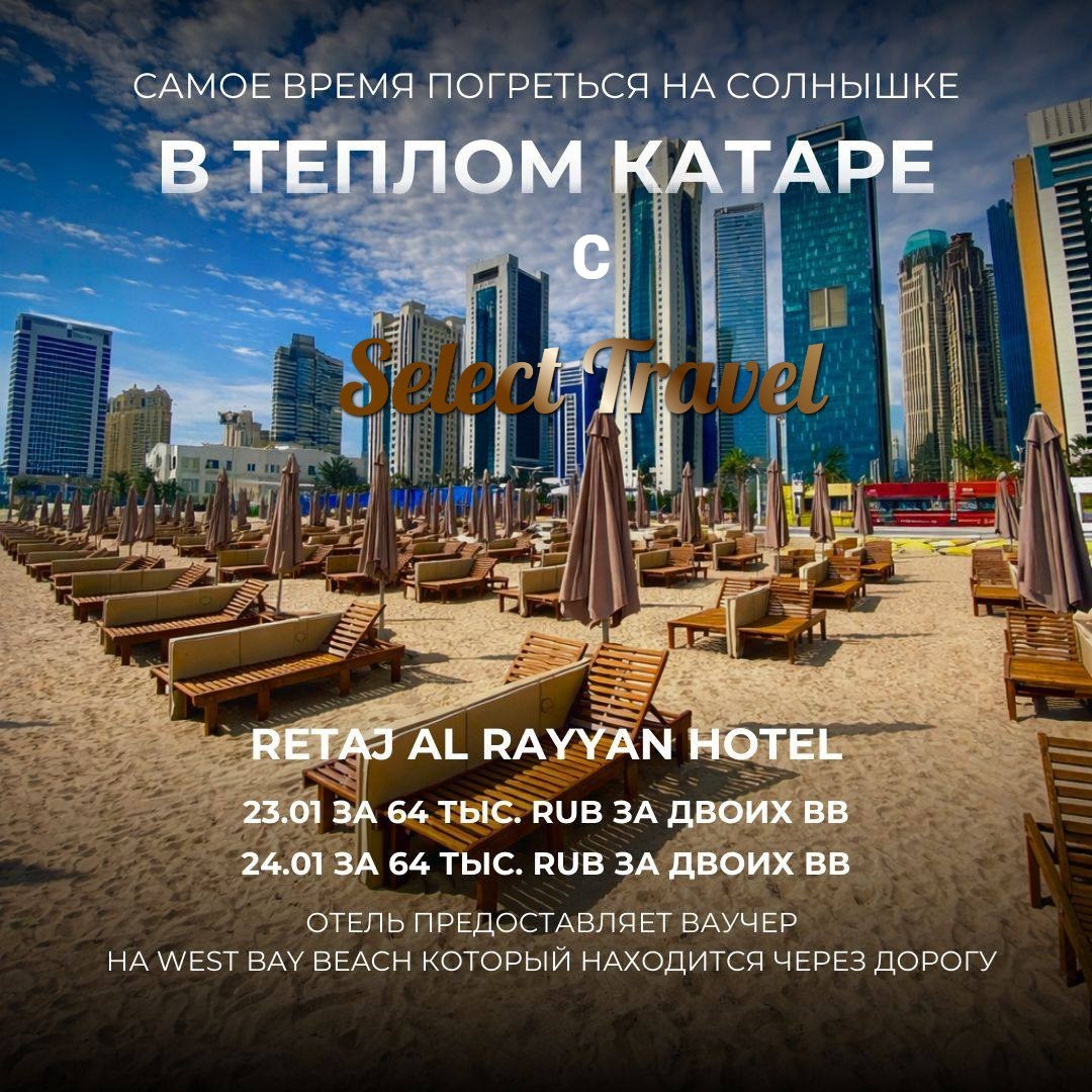 🇶🇦🏝️! ✈️ У нас есть рейсы из Москвы на борту а/к Аэрофлот 23.01 и 24.01 — на 7 ночей с завтраками 🔥. 🌇 Останавливайтесь в Retaj Al Rayyan Hotel: 📅 23.01 — 64 000 ₽ за двоих, BB 📅 24.01 — 64 000 ₽ за двоих, BB 🏖️ Также отель предоставляет ваучер на West Bay Beach, прямо через дорогу. 🌴 Погода в Дохе обещает быть прекрасной: +20–+24°C, солнечно 😎. 💙 Не стесняйтесь обратиться к нам для бронирования и получения дополнительной информации! 📞 8 800 234-49-01 📞 +7 903 222-92-60 📞 +7 932 253 70-69 📧 selecttravell@mail.ru