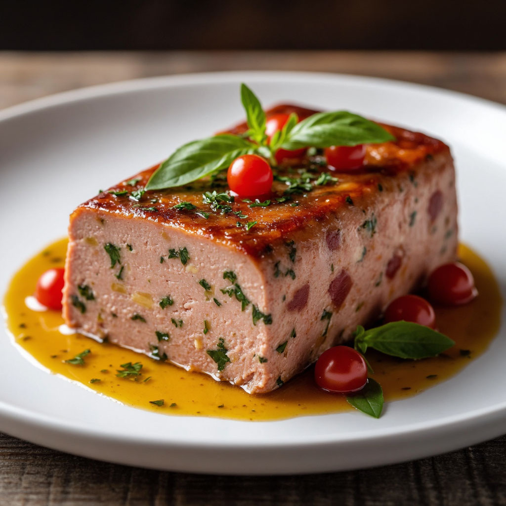 8. Подача: Перед подачей аккуратно извлеките террин из формы, перевернув его на сервировочную доску. Нарежьте острым ножом на ломтики толщиной около 1-1.5 см.