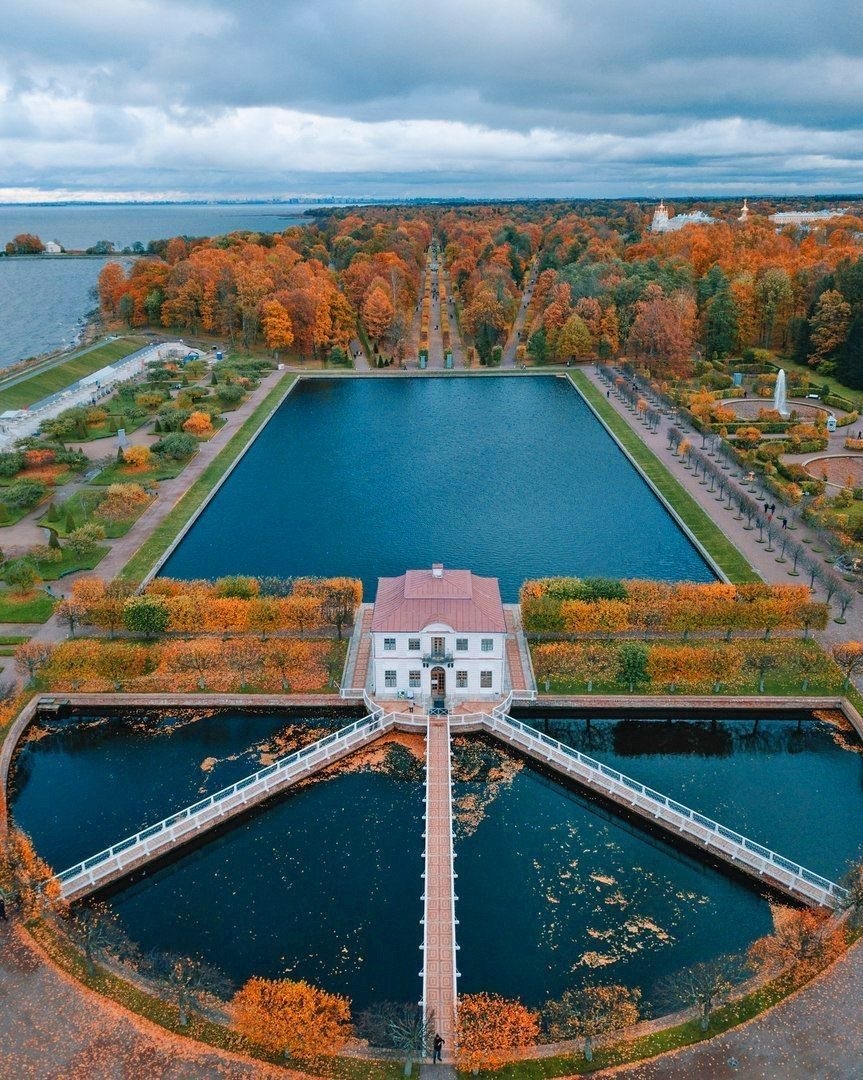 Взгляните на эту завораживающую панораму! Перед вами — дворец Марли, жемчужина Нижнего парка Петергофа, окутанная золотым осенним убранством. Это не просто архитектурный памятник, а настоящий шедевр, где каждая линия, каждый элемент продуман до мелочей. 🏰
