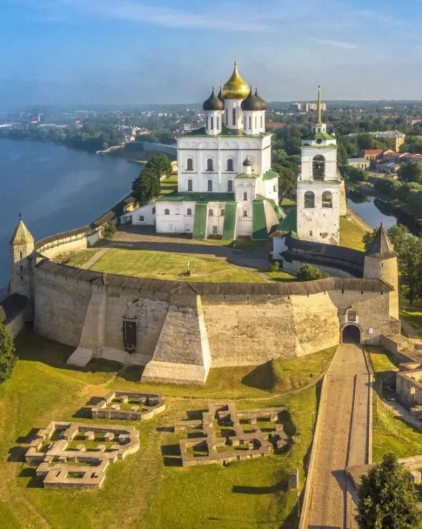 Перед вами — величественный Псковский Кром (Псковский Кремль), сердце древнего Пскова, застывшее во времени. Этот уникальный архитектурный ансамбль словно сошёл со страниц летописей: мощные крепостные стены, золотые купола Троицкого собора и живописные изгибы реки Великой создают неповторимую картину. 🏰