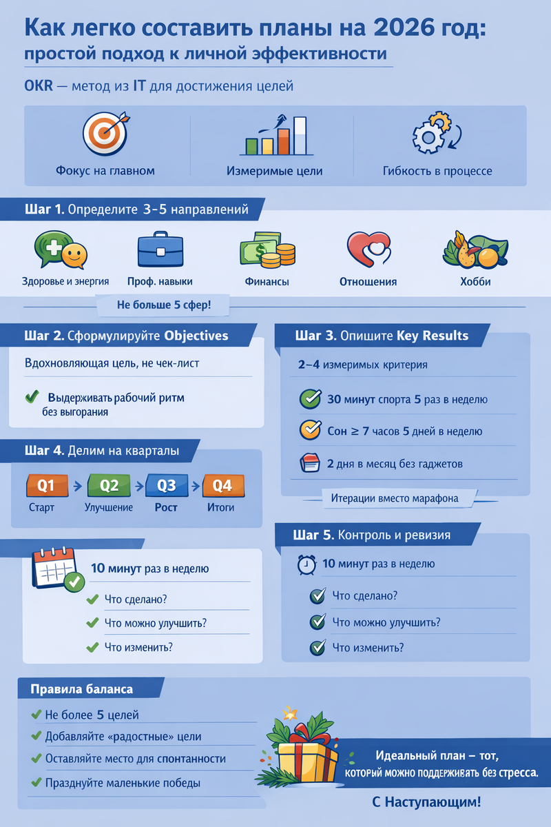 Начало года - лучшее время не для списка желаний, а для настройки системы. За годы в IT я убедился: хаотичные цели сгорают к февралю, а простая структура живет весь год. Делюсь адаптацией OKR (Objectives & Key Results) - методологии, которую мы используем в командах, но которая отлично работает и для личного планирования. Почему OKR? Эта методология из мира IT отлично работает и для личного планирования: Не больше, иначе внимание расползается. Отберите сферы, где хотите роста в 2026‑м. Примеры: Для каждого направления задайте амбициозную, но вдохновляющую цель. Цель должна “зажигать”. Примеры: Важно: цель не должна быть слишком детализированной - это ориентир, а не чек‑лист. К каждой цели приведите 2-4 измеримых критерия. Они отвечают на вопрос: “Как я пойму, что цель достигнута?”. Примеры для цели "Стать человеком, который легко выдерживает рабочий ритм без выгорания": Не стремитесь охватить год целиком. Разбейте цели на квартальные итерации: Январь -март: запускаем привычки, тестир