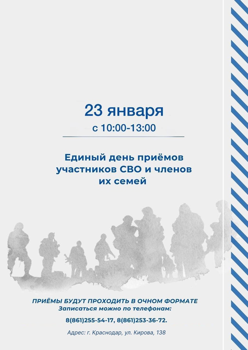💪🏻 Участники СВО и члены их семей получат консультативную помощь представителей профильных министерств, краевого военкомата, Ассоциации юристов России и депутатов. Где можно подать обращение? Смотрите на сайте 👉🏻 clck.ru/3RN9Jc Актуальную информацию о выплатах, возможностях реабилитации и контактных данных всех ведомств смотрите здесь 👉🏻 clck.ru/3RN9yH Запись по телефону: +7 (861) 255-54-17 +7 (861) 253-36-72