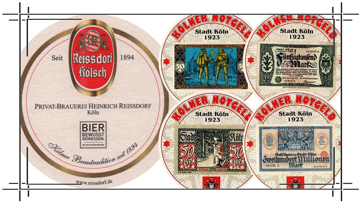 В своё время, нотгельды использовались по назначению. Ими расплачивались, их продавали/покупали. Времена шли, но тема так и осталась не закрыта. Сейчас, конечно же, нотгельд стал исключительно, как собирательный материал. Их коллекционируют, изучают, находя до сих пор всё новые и новые виды и разнотипы. Но вот добрались они и до рекламы.... Те, кто коллекционируют пивные бирдекели, будут заинтересованы. Так, частная пивная компания из Кёльна Heinrich Reissdorf, основанная ещё в далеком 1894 году, естественно Генрихом Райсдорфом, упомянула тему нотгельдов на своей продукции. В знаменитой Кёльнской пивоварне были выпущена серия пивных бирдекелей, на которых были изображены нотгельды Кёльна исторического периода. К сожалению, когда были произведены данные пивные подставки не известно. Представлено лишь 12 образов подобных изданий. К деньгам, конечно же, эти "кружочки" никакого отношения не имеют, но в плане коллекционного материала - как напоминание об этом захватывающем периоде - почему