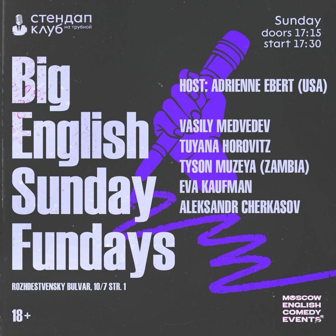 ❕ Our hit event Big English Sunday Fundays at Stand Up Club on Trubnaya is here with some of our most professional performers 👩🏫 Vasily Medvedev 🧐 has a lot of deep observations Tuyana Horovitz 📝 has been writing new stuff, just for you! Tyson Muzeya (Zambia) 🌍 just got back from Africa and has a lot to share Eva Kaufman 💪🏻 has been busy as heck recently Aleksandr Cherkasov 😑 has wants to be first both on stage and in love and our host Adrienne Ebert (USA) 🥺 wants to ask you about your cats Stand Up Club на Трубной 🕢Time: 17:30-18:55 🗺️Address: Rozhdestvensky Blvd, 10/7 С1 🎟Entrance: FREE. 💸 Donations for the show are welcome, one drink minimum required 🍸 🔗Click to reserve seats here!