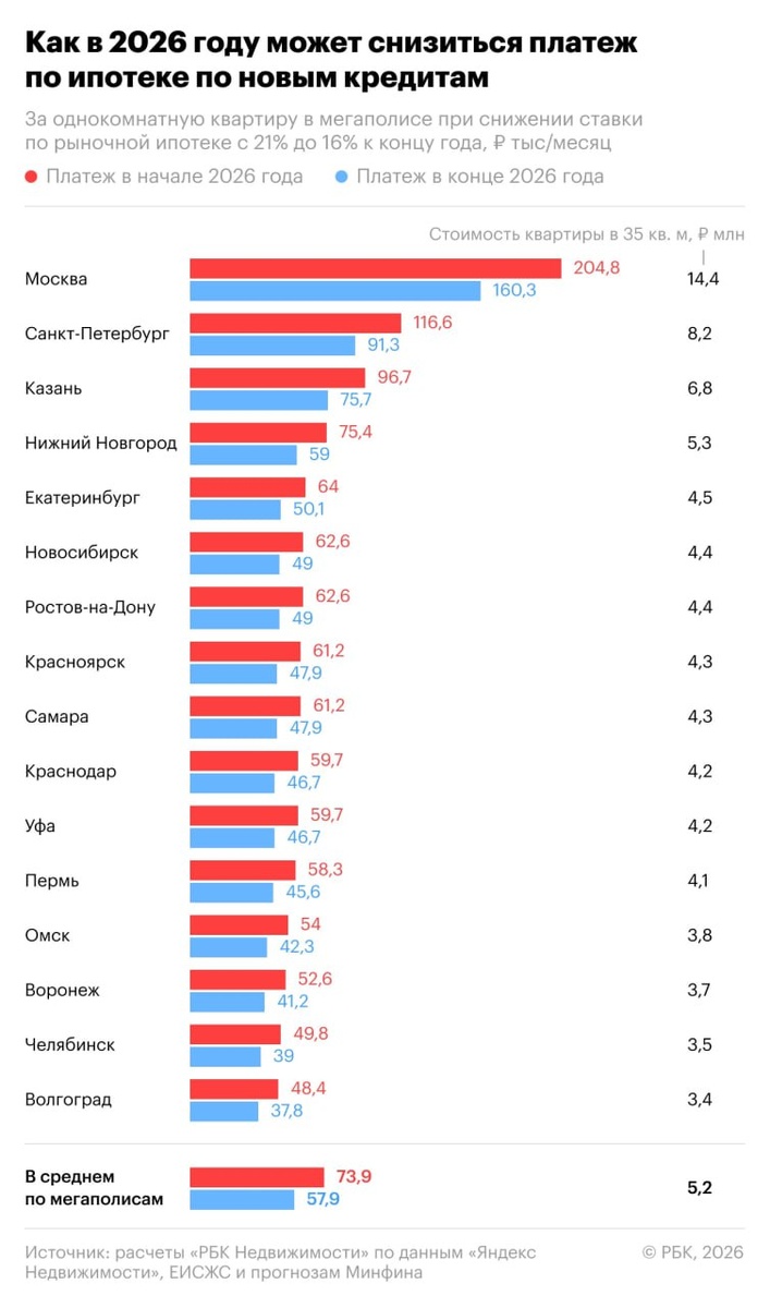 По оценке «РБК Недвижимости», при покупке однокомнатной квартиры в крупном городе платёж снизится примерно с 74 до 58 тыс. рублей. Такой сценарий основан на прогнозе Минфина, который ожидает падение средней ипотечной ставки с нынешних 21% до 16% к концу года.