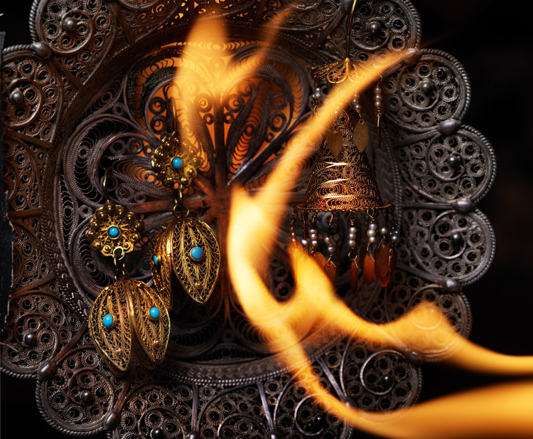Традиционные женские украшения из коллекции Музея истории Азербайджана Серьги, золото, филигрань, бирюза. Баку, конец XIX века