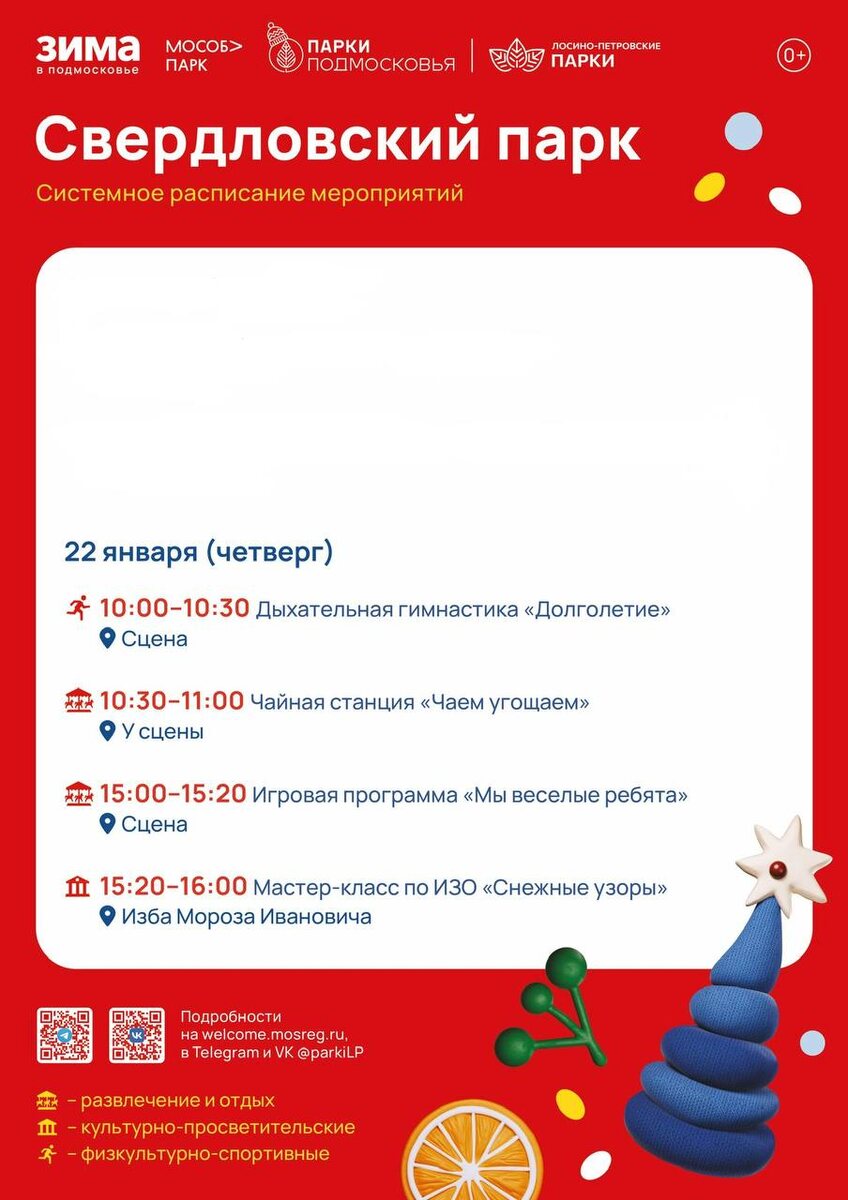✨ В парках продолжается январская программа, наполненная теплом, спортом, творчеством и молодёжным драйвом. На этой неделе гостей ждут уютные, активные и очень весёлые события. 📍 Свердловский парк приглашает в четверг, 22 января, начать день с оздоровительной дыхательной гимнастики «Долголетие», согреться на чайной станции, а после обеда повеселиться с детьми на игровой программе и создать своими руками «Снежные узоры» на творческом мастер-классе. 🧑🎓 Главный праздник для молодёжи и всех активных гостей ждёт в это воскресенье, 25 января, в Свердловском парке. Здесь в 12:00 стартует грандиозная программа «Зачётный парк», посвящённая Дню студента! Вас ждёт тематическая фотозона, угощения в чайной зоне, игра в гигантскую дженгу и интересная фотовыставка. 🎫 Для любителей спорта – товарищеский забег, а для эрудитов – увлекательный квест и музыкальное лото. Кульминацией праздника станет интерактивная программа «Счастливый билет» с розыгрышем умной колонки «Яндекс Станция» и сертифика