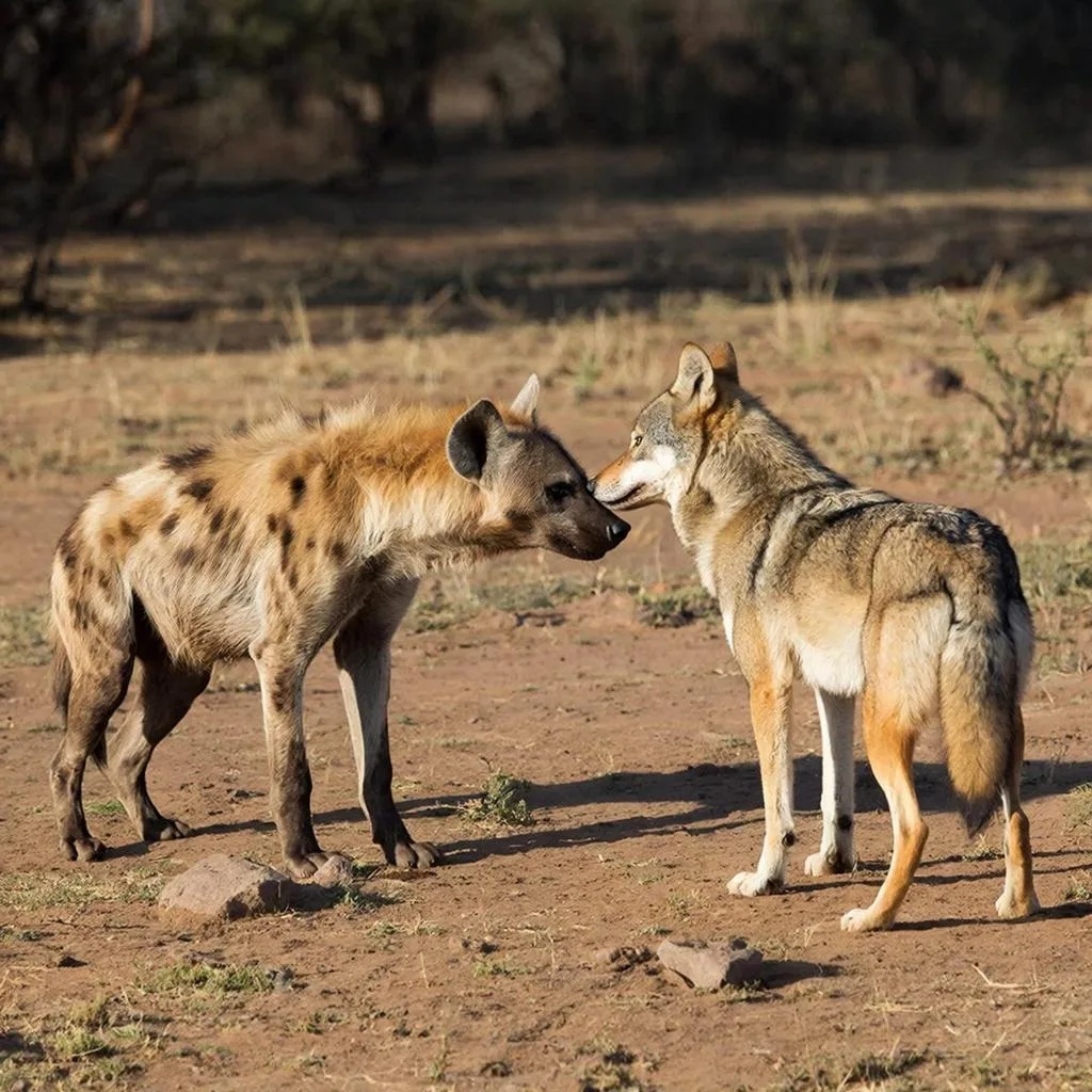 Волки также относятся к семейству псовых и являются социальными животными, живущими в стае. Их тело более стройное по сравнению с гиенами, однако они отличаются развитыми мышцами шеи и спины, позволяющими им удерживать добычу во время охоты. Средний вес взрослого волка составляет около 45-70 кг, хотя размеры могут варьироваться в зависимости от подвида и региона обитания. Волки способны развивать скорость до 65 км/ч при коротких дистанциях. Но очень выносливые на длинные расстояния.
