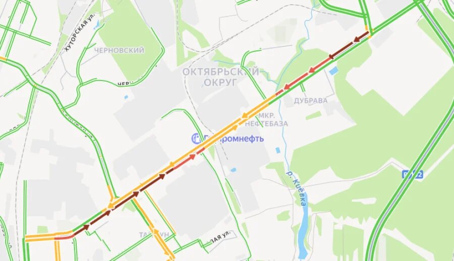 Большая пробка образовалась днём в среду, 21 января. Со стороны центра города машины стоят от перекрёстка с Моторной до Дубравы. В сторону центра пробка начинается от развязки с окружной дорогой. Точных данных о причинах затора пока нет. По одной из версий, закрыто движение через железнодорожный переезд в районе нефтебазы.