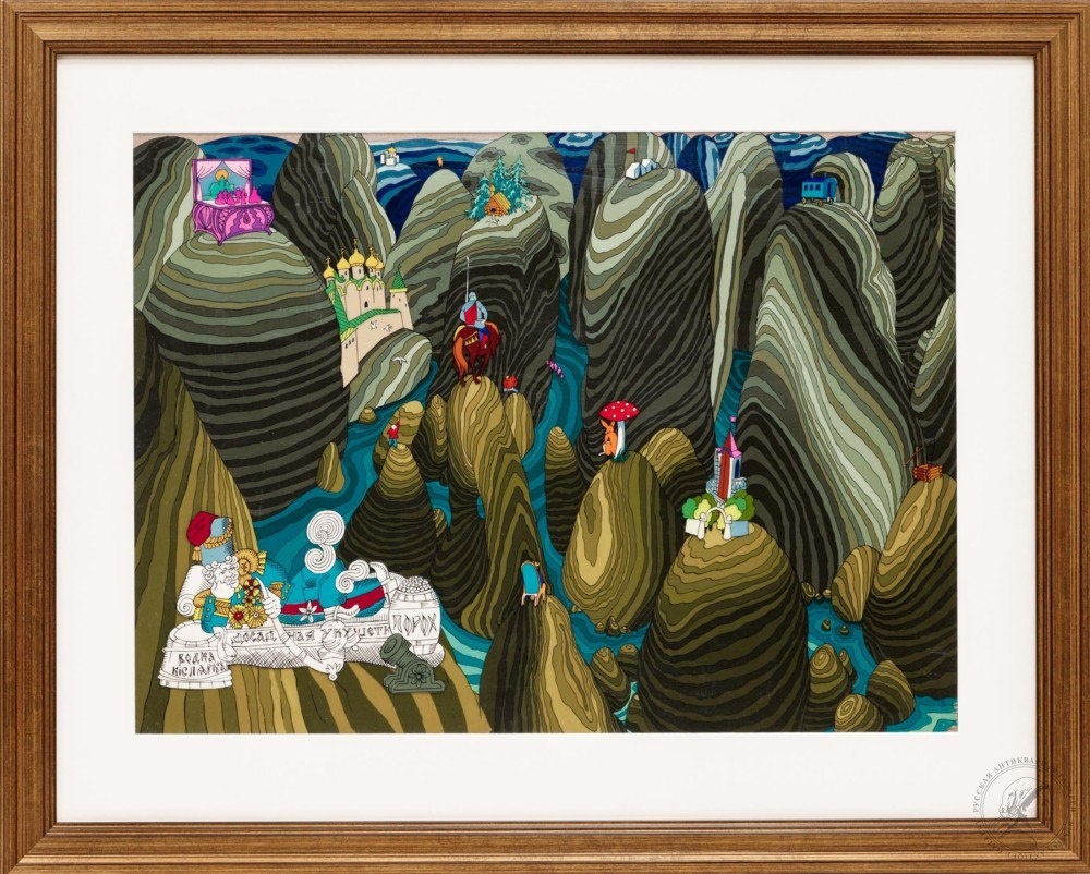 Сайт: rus-gal.ru #Кошкин Николай Иванович - #Фаза из мультфильма «#Юбилей» (2) #СССР, 1983 год. Бумага, акрил, целлулоид. 33 Х 45,5 см #Мультипликация #Соцреализм Подробнее: https://rus-gal.ru/works/faza-iz-multfilma-yubilej-2/
