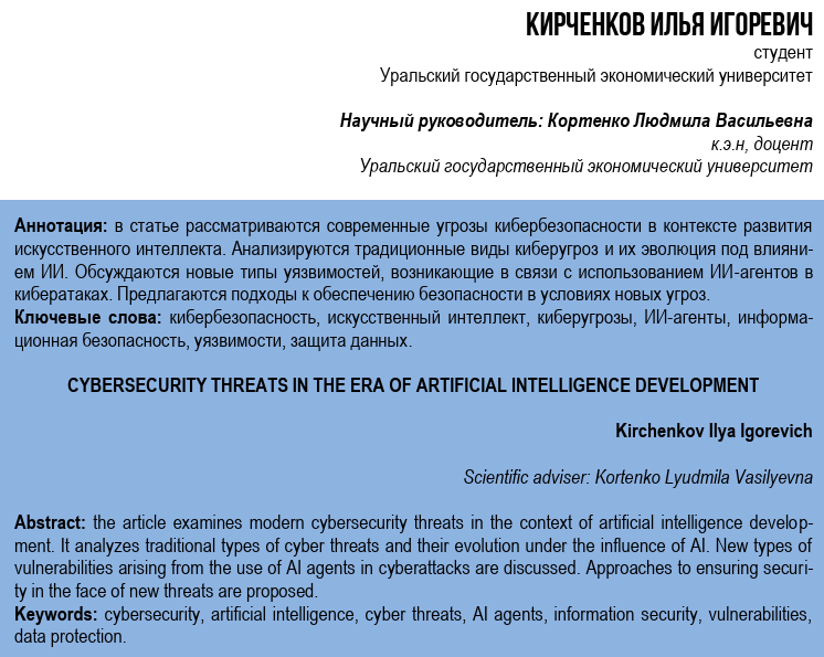 Для цитирования: Кирченков И.И., Кортенко Л.В. УГРОЗЫ КИБЕРБЕЗОПАСНОСТИ В ЭПОХУ РАЗВИТИЯ ИСКУССТВЕННОГО ИНТЕЛЛЕКТА // В сборнике: Актуальные вопросы общества, науки и образования. сборник статей XIX Международной научно-практической конференции. Пенза, 2025. С. 27-30.