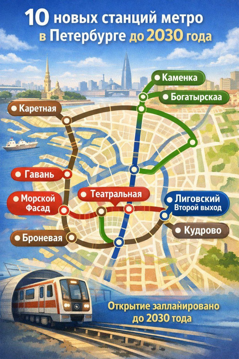 Смольный подтвердил масштабные планы по развитию подземки. До 2030 года карта метро Петербурга серьезно изменится. Планируют продлить коричневую линию до «Каретной» и продолжить зелёную ветку в сторону «Каменки» и «Богатырской». Также в списке — «Гавань», «Морской фасад», «Броневая», «Театральная», второй выход «Лиговского» и станция «Кудрово».