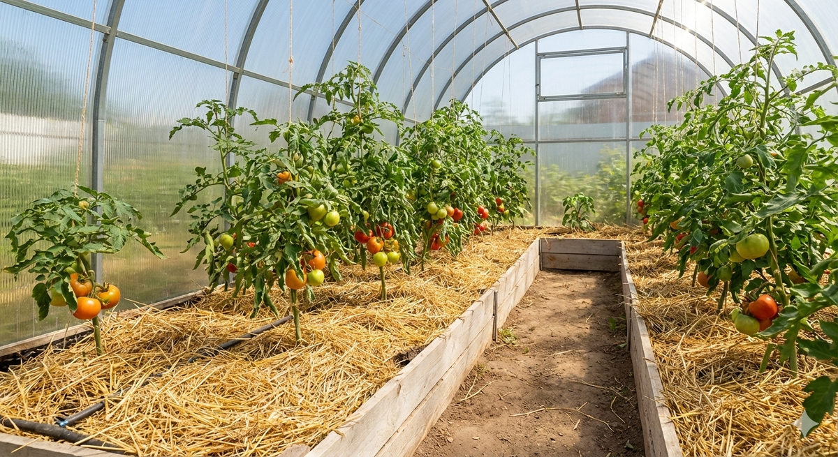 - В теплице: здесь главная проблема — влажность воздуха, провоцирующая фитофтору. Мульчирование томатов сухой травой или соломой отсекает испарение влаги из почвы. В итоге земля под мульчой влажная, а воздух в теплице сухой. Это лучший способ профилактики болезней без химии.
