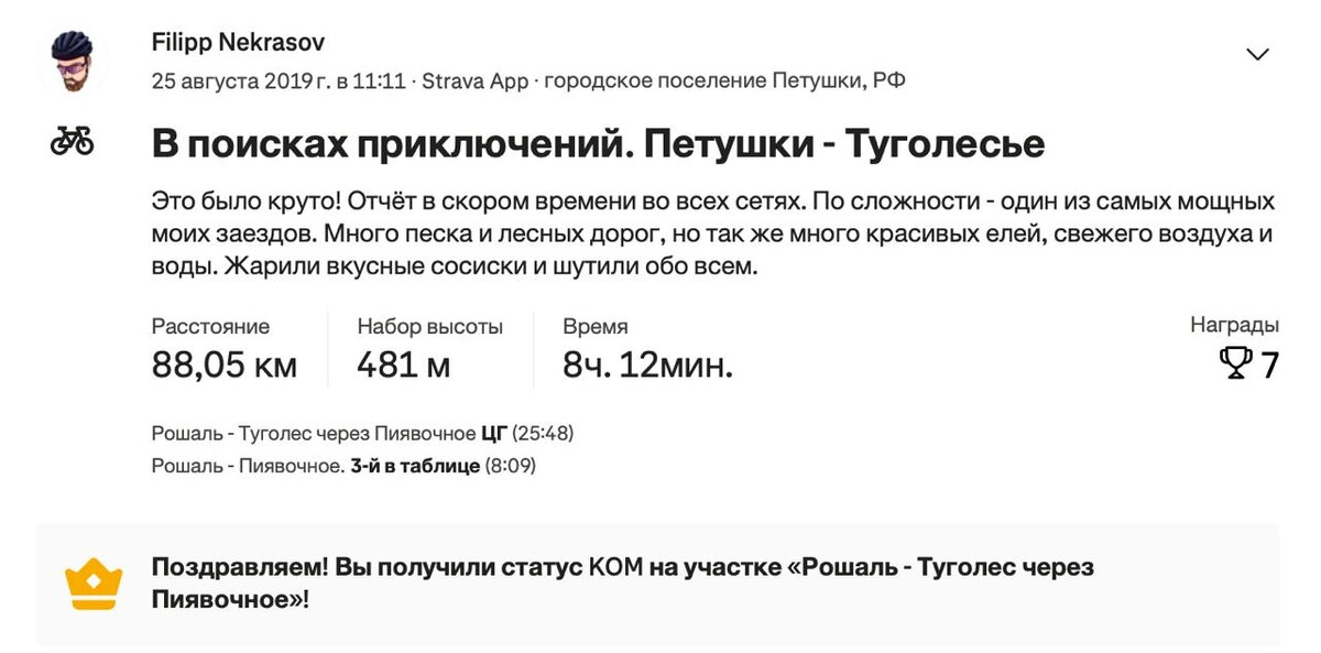 И о боги, у меня даже там был КОМ! Стравой уже давно не пользуюсь, как перестал интересовать соревновательный процесс, а раньше помнится даже и подписку оплачивал... Помню, как мы тогда резко решили успевать на ближайшую электричку и втопили с Денисом и Антоном. Было время. Еще даже за изотоником успели заехать. Было время, ха-ха. Как у вас? Следите за своими показателями или уже больше катаетесь в удовольствие? P.S. фотки с той поездки в комментах!!