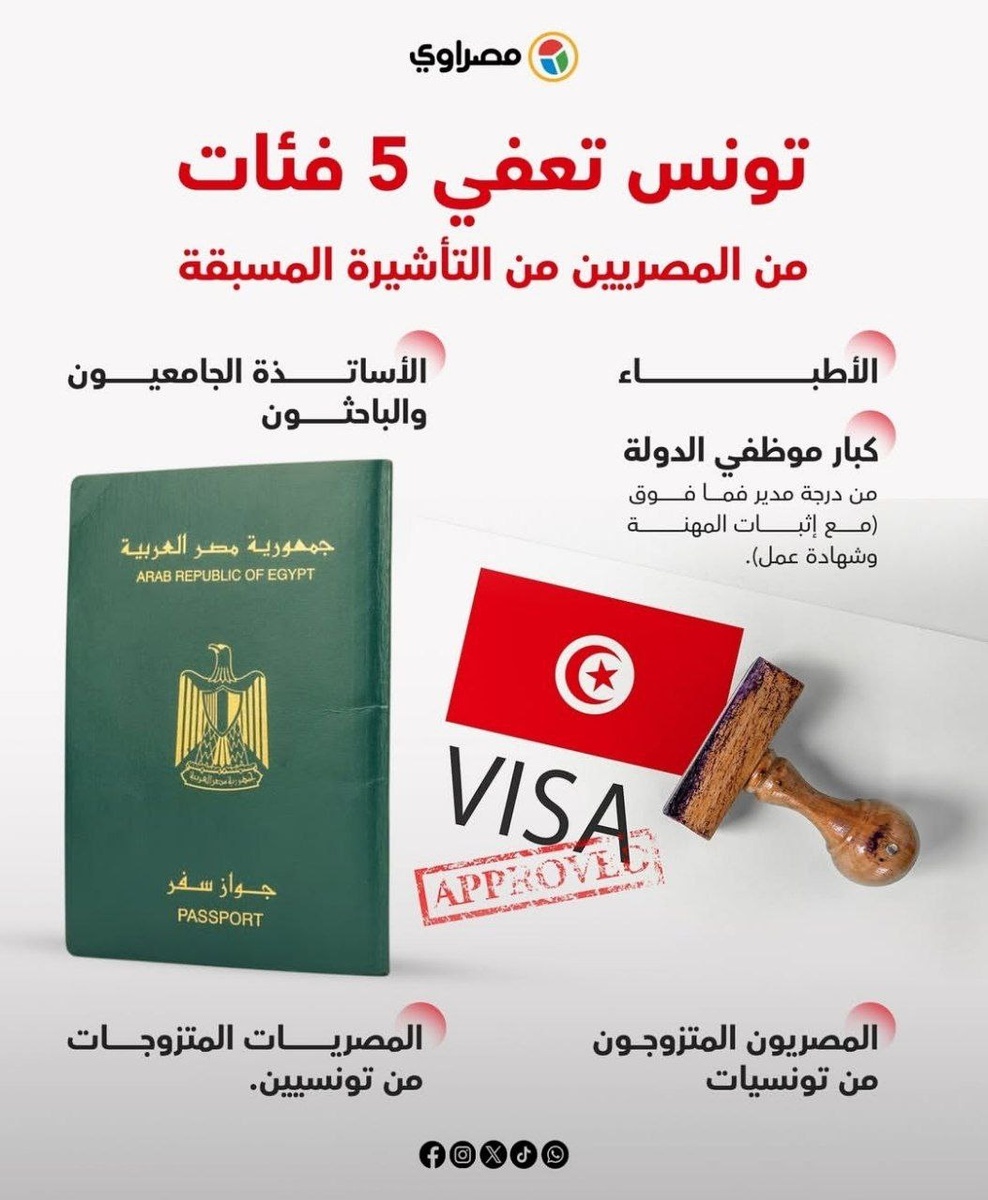 Тунис принял решение освободить пять категорий египтян от необходимости получения предварительной визы. 🔹 Кто может въезжать без визы: 👨⚕️ Врачи 🏛 Высокопоставленные государственные служащие — должность директора и выше — при наличии подтверждающих документов и справки с места работы 🎓 Университетские преподаватели и научные сотрудники 💍 Египтянки, состоящие в браке с гражданами Туниса 💍 Египтяне, состоящие в браке с гражданками Туниса 📌 Решение направлено на упрощение передвижения и укрепление связей между двумя странами. ▶️Больше новостей и инфы https://dzen.ru/id/5c727b90e6ece300b3a75a1c