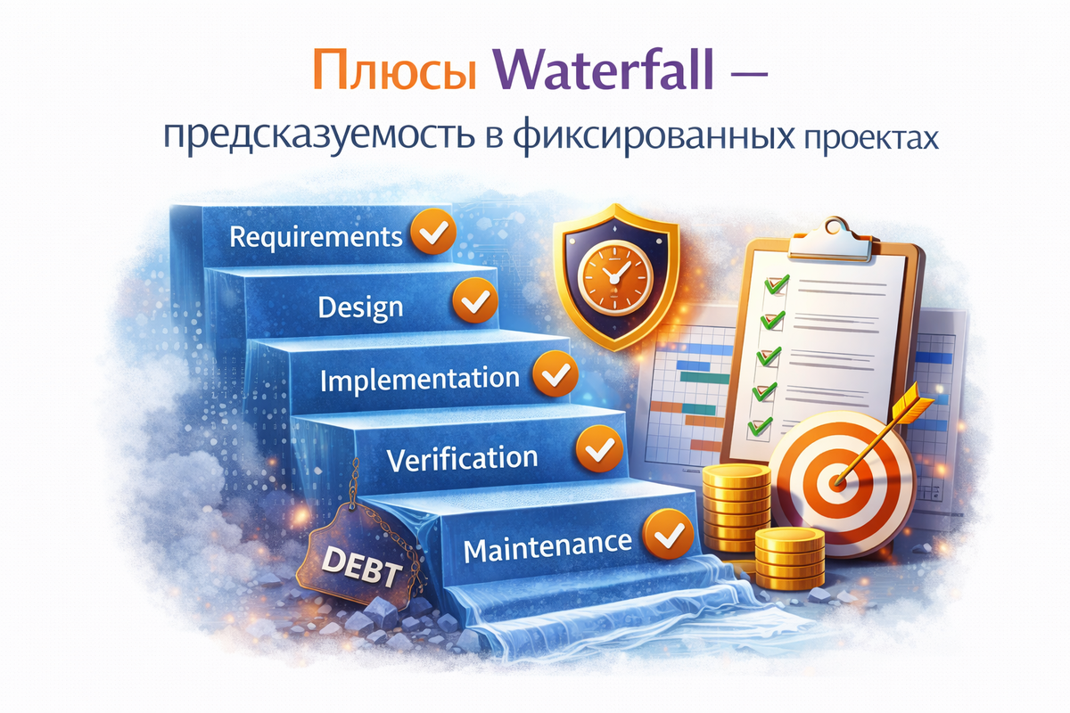 Плюсы Waterfall - предсказуемость в фиксированных проектах