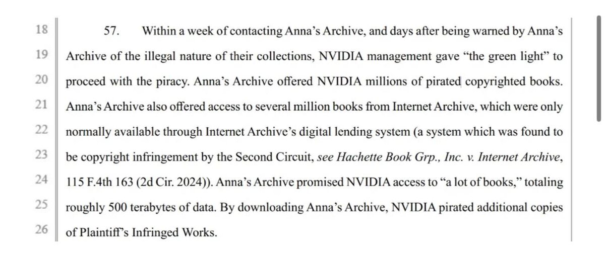 В начале 2024 года группа авторов подала иск против NVIDIA, обвинив компанию в использовании пиратского датасета Books3 для обучения своих моделей. NVIDIA заявила, что это подпадает под «добросовестное использование». В рамках расширенного иска опубликована переписка между сотрудником NVIDIA и представителями Anna’s Archive — теневой библиотеки с защищёнными книгами и статьями. Сотрудник NVIDIA интересовался возможностями доступа к корпусу книг. • Anna’s Archive предупредили о незаконности данных и запросили подтверждение разрешения на работу с ними. • Через неделю руководство NVIDIA одобрило доступ, сославшись на конкурентное давление. • Anna’s Archive предоставили доступ к данным, объём которых оценивается примерно в 500 ТБ.