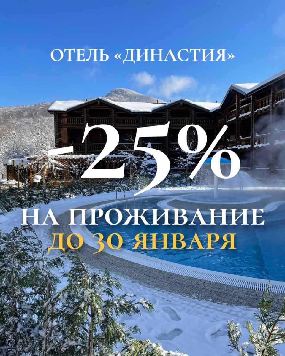 отель «Династия» дарит особый комплимент✨ С 25 по 30 января 2026 года для всех Татьян действует скидка 25% на проживание! Как воспользоваться предложением: — Забронируйте любой номер в отеле «Династия». — Укажите промокод TATYANA25 и получите скидку 25%. В стоимость проживания входит: • Завтраки • Подогреваемый бассейн • Финская сауна • Детская комната с аниматором • Мангальная зона и беседки • Wi-Fi • Халаты, косметические принадлежности и уют в номере Подарите себе или близкой Татьяне спокойные, тёплые дни отдыха в атмосфере комфорта и заботы! Период действия предложения: 25–30 января 2026 года