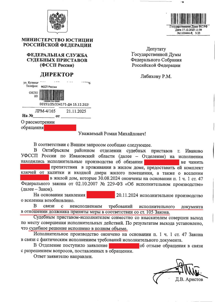 Вопросы, связанные с гражданскими спорами, в которых принимают участие соседи или родственники, наверное, самые трудные в нашей практике. А всё потому, что в основе их лежат личные взаимоотношения, и проблему не всегда получается разрешить в досудебном порядке. Но даже после вынесения судебных решений конфликтующие стороны не спешат завершать споры, примиряться и продолжать жить спокойно. И вот наглядный пример. В нашу «Народную приёмную Ивановского обкома КПРФ» обратилась жительница города Иванова с жалобой на бездействие судебных приставов-исполнителей. Ей на праве общедолевой собственности принадлежит 77/400 доли в жилом доме. Собственник другой части доли, родственник заявительницы, чинит препятствия вселению и проживанию заявительницы. Решением районного суда от 2023 года определено вселить заявительницу в указанное жилое помещение, а родственника обязать не чинить препятствия гражданке в проживании в жилом доме, предоставив ей комплект документов от калитки и входной двери жилог